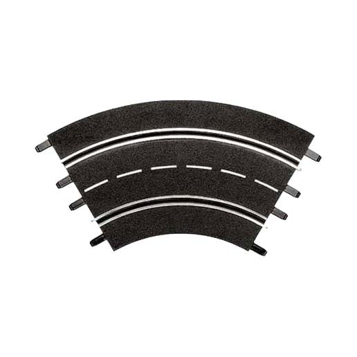 Set van 3 gebogen baandelen (Bocht 1) in schaal 1:24, elk met een hoek van 60°, samen 180°. Geschikt voor Carrera DIGITAL 124, DIGITAL 132 en EVOLUTION. Gemaakt van kunststof, aanbevolen vanaf 8 jaar.