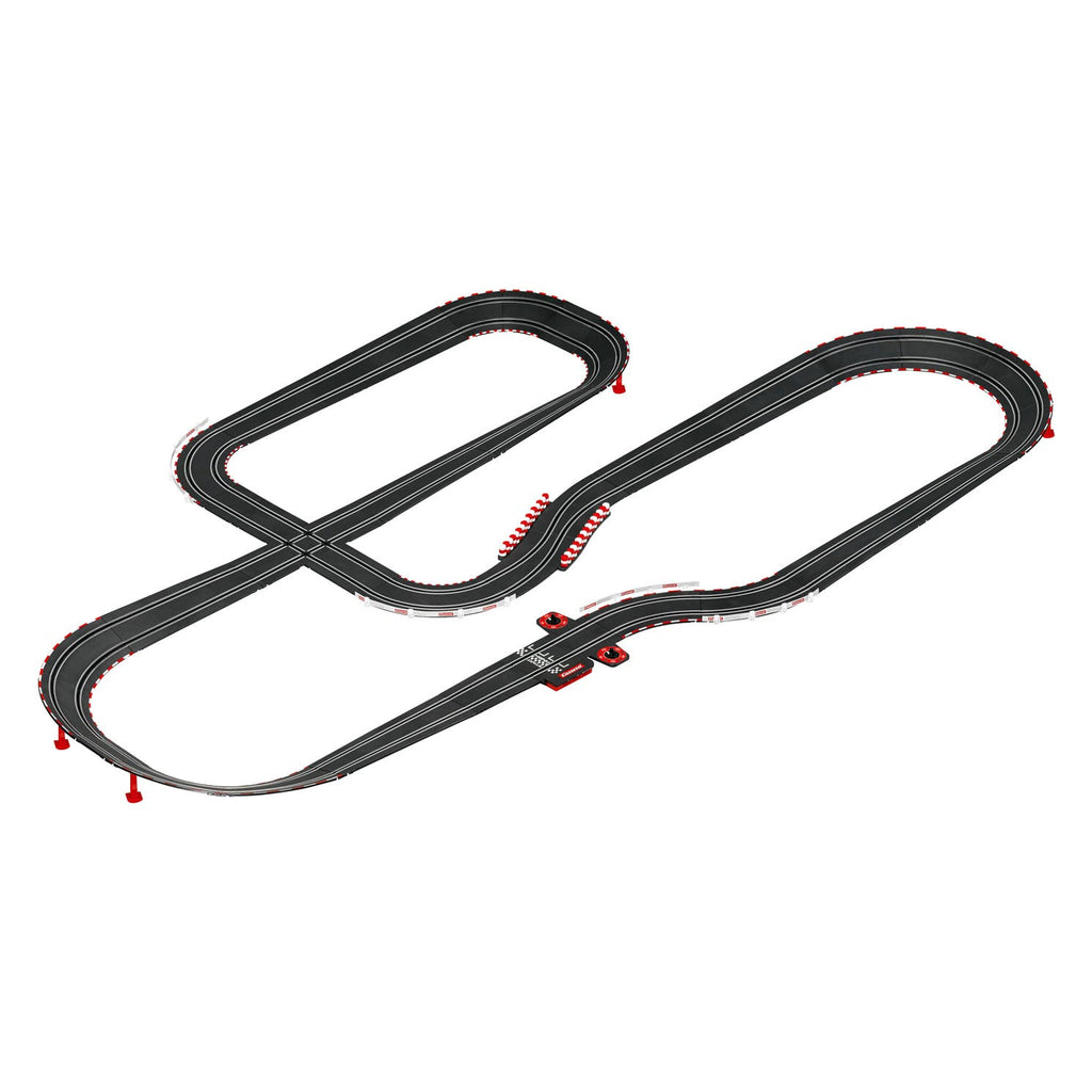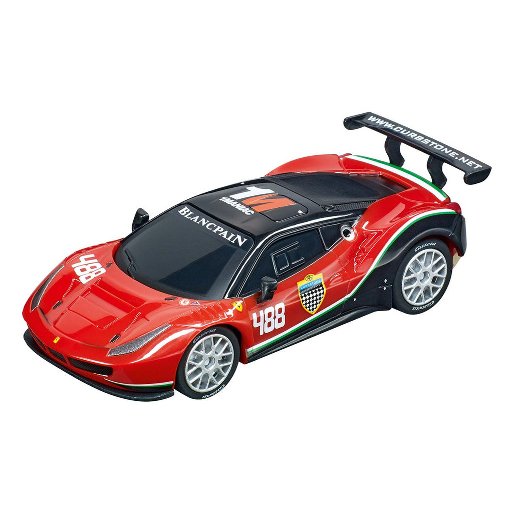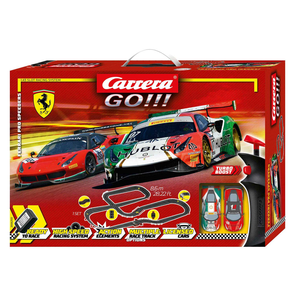 Italiaanse pedal-to-the-metal sensatie! - De Carrera GO!!! 'Ferrari Pro Speeders' set draait om topsnelheid. Twee echte professionals van de lange-afstandsracerij ontmoeten elkaar op het Carrera-circuit. De Ferrari 488 GT3 'Squadra Corse Garage Italia, No.7' in de opvallende rode, groene en witte livrei van de Italiaanse tricolore zet de voet op de grond voor de overwinning tegen zijn landgenoot rond het 8,6 meter lange racecircuit. De felrode supersportwagen Ferrari 488 GT3 'AF Corse, No.488' kan zijn rivaal in elk aspect van vermogen en prestaties evenaren. Lange rechte stukken, steile bochten, chicanes en kruispunten bieden Carrera-coureurs supertoffe uitdagingen om op te lossen op hun met een turboknop uitgeruste handsets, maar met genoeg oefening en plezier slaagt elke junior coureur erin om een echte kampioen te worden!