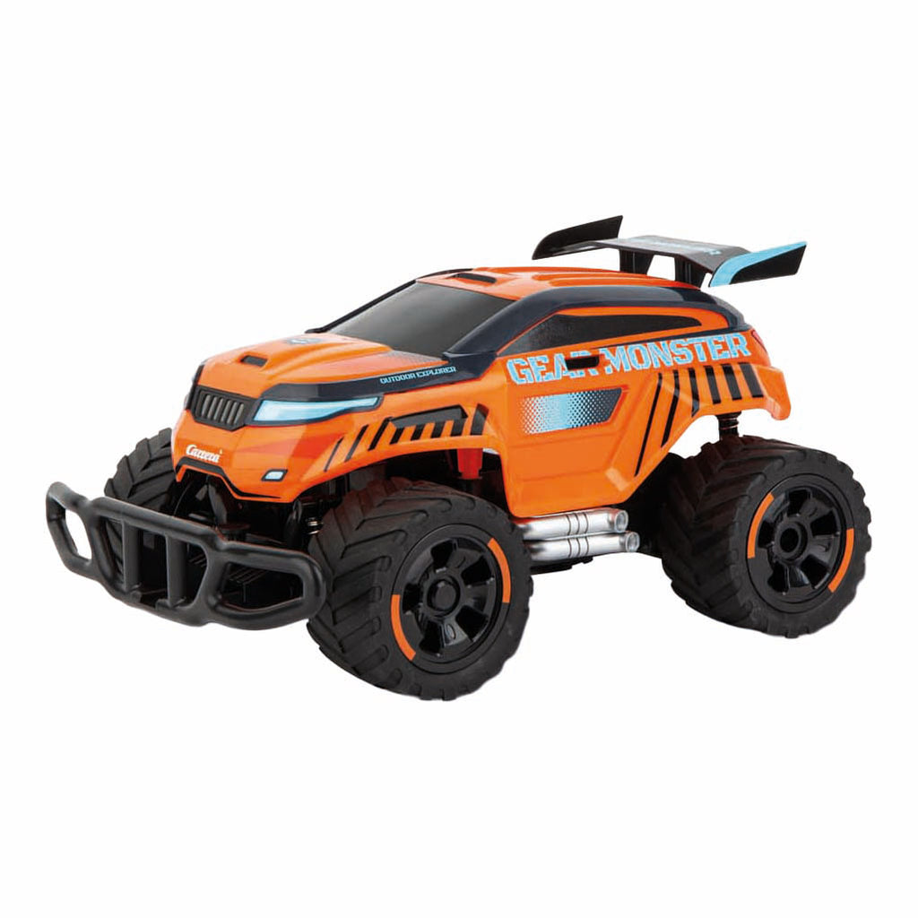De Carrera RC Gear Monster 3. maakt elk terrein onveilig. De machtige o ffroader in fel oranje is uitgerust met grote luchtbanden die hem over heuvel en dal brengen op koel e ritten. Of het nu op rotsachtige paden of heuvelachtige weiden is - de 28 cm lange offroader schit tert bij topsnelheden tot 12 km/u en brengt veel snelheid in elk avontuur. Dankzij de nauwkeurige Fu ll Function-bedieningselementen zijn spectaculaire manoeuvres en wendbare richtingsveranderingen geg arandeerd. Tot 16 voertuigen kunnen tegelijkertijd strijden in spannende onderlinge races, terwijl d e oplaadbare batterij tot 2 minuten pure actie biedt. Met zijn opvallende oranje ontwerp en nieuwe USB-C-batterij is de Gear Monster 3. altijd klaar om aan je volgende avontuur te beginnen>