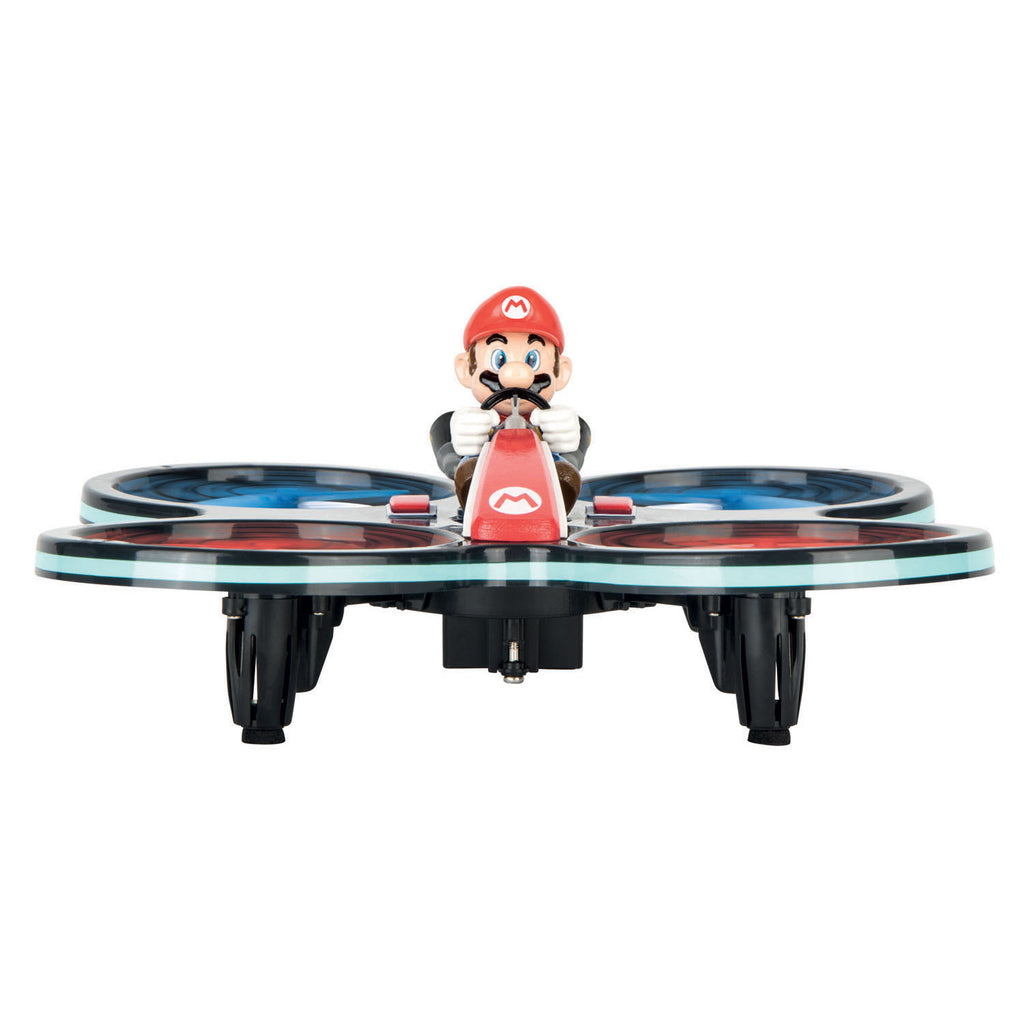 Super Mario houdt van snelheid op het land, maar ook in de lucht. Met deze Mini Mario-Copter houdt Super Mario vanuit de lucht een oogje in het zeil. De Mario-Copter heeft 4 propellers en een rotor beschermkooi waardoor het makkelijk is om te vliegen. De mini Mario-Copter kan loopings maken en heeft een automatische start- en landfunctie. Verder zit er op de mini Mario-Copter een Beginner-Advanced schakelaar, zodat zowel beginners als gevorderden de mini Mario-Copter kunnen besturen. Het Gyro-systeem zorgt voor een stabiele vliegtoestand en de 2,4 Ghz technologie zorgt ervoor dat het vliegen niet verstoord wordt. Geschikt om in- en outdoor ermee te vliegen. Speelduur tot 5 minuten. De mini Mario-Copter werkt op één 3,7 V 430mAh Lipo accu (inbegrepen) en de controller op 2 x AA batterijen (inbegrepen).