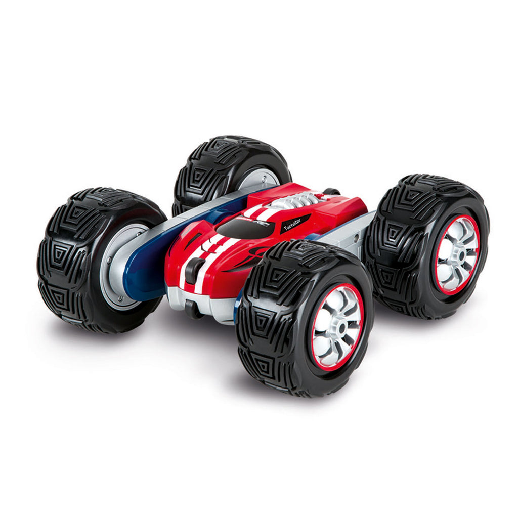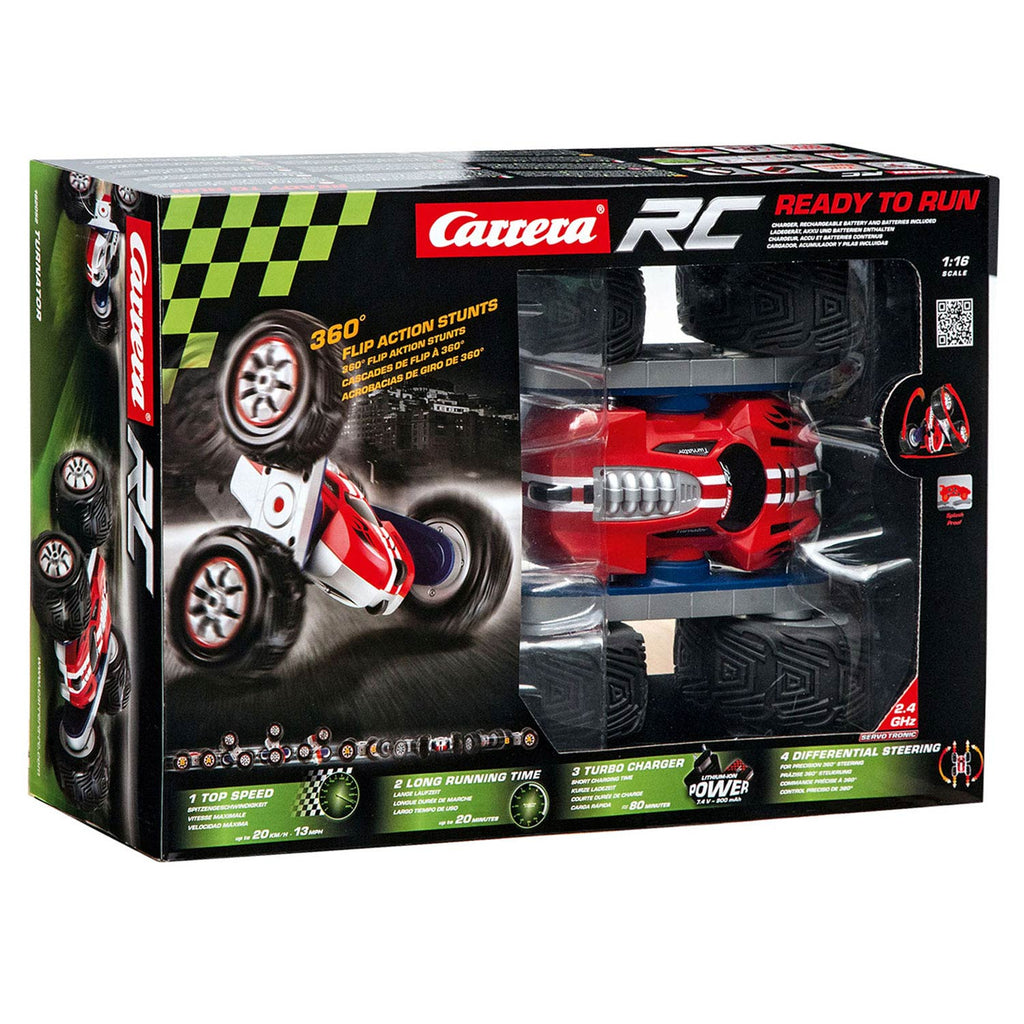 Super cool, er rijdt een Turnator voor je voeten en haalt allerlei gave stunts uit! De Carrera RC - Turnator is een op afstands bestuurbare auto met enorme wielen op een schaal van 1:16. Je bestuurt hem met de bijgeleverde afstandsbediening. De Carrera RC - Mini Turnator kan tot maar liefst 20 kilometer per uur rijden, zijn 2 wielen aan beide kanten omdraaien, 360 graden draaien en meerdere rondjes om zijn as spinnen! Werkt op 2 AAA batterijen (exclusief) en een 7,4V Accu, die bij de set wordt geleverd.