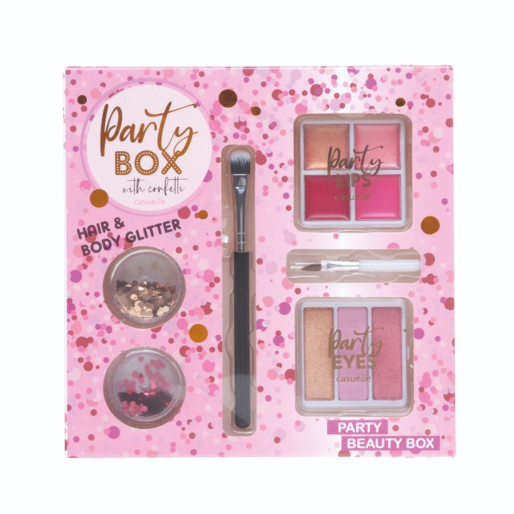 Een mooi make-up pakket van Casuelle. Inhoud: 2 kleuren glitter, 4 kleuren rouge, 4 kleuren oogschaduw, en 2 kwastjes. Het pakket bevat tevens confetti voor een extra feestelijke stemming. Geschikt voor kinderen vanaf 5 jaar.