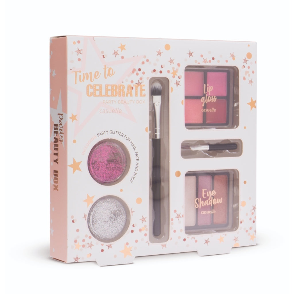 Casuelle Time To Celebrate make-up set met 4 kleuren lipgloss, 3 kleuren oogschaduw en 2 kleuren glitters voor haar, gezicht en lichaam. Inclusief 2 kwastjes voor het aanbrengen. Geschikt voor kinderen vanaf 5 jaar.
