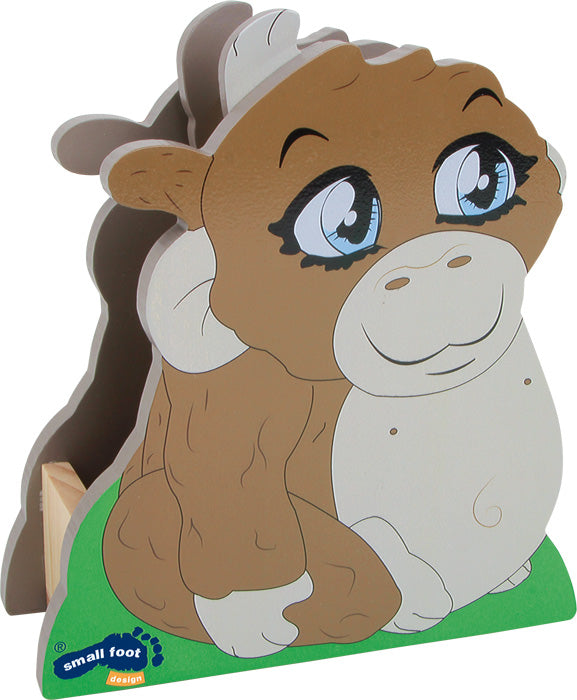 Kijk uit! Aapje is aan het schieten! Het kleine plankje aan de binnenkant van de aap is voorzien van een elastiekje dat dit voorwerp in een katapult verandert. Kleine bolletjes kunnen over enige afstand worden afgeschoten. Op de buitenzijden is de aap afgebeeld als een filigreerde tekening.