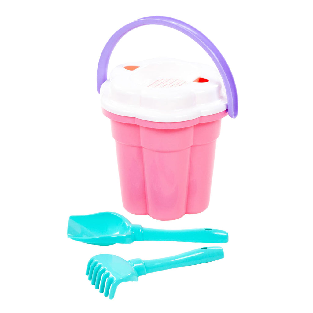 XL emmer van Cavallino (20x20x30cm) in pastelroze met 4 accessoires; een schepje, een harkje en een zeefdeksel. Geschikt voor kinderen vanaf 12 maanden oud.