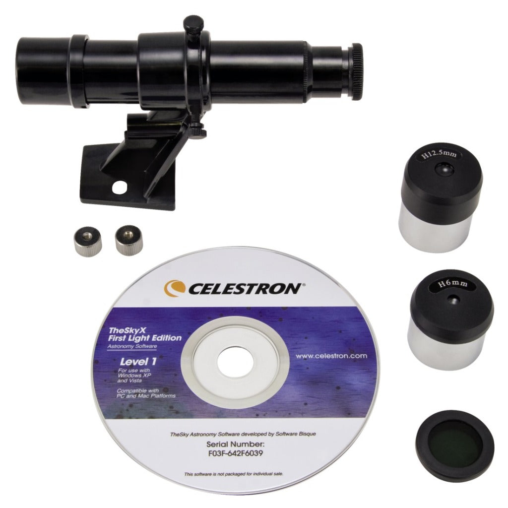 - Een 5x24 Finderscope en steunlatje ? Deze finderscope met steunlatje maakt het makkelijker om astronomische objecten te lokaliseren met de FirstScope telescoop dankzij zijn veel bredere gezichtsveld en lage vergroting. Er zijn geen extra instrumenten nodig voor de opstelling