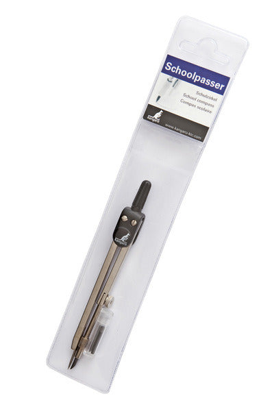 Schoolpasser vervaardigd van mat vernikkeld metaal. Met tandrad-rechtgeleiding. Passerinzet verwisselbaar, geschikt voor inzetstukken van 3.0 mm. Stift 2mm en kokertje met 2 reservestiften wordt meegeleverd. Lengte van de passer: 120 mm, voor cirkel tot Ø 340 mm. Verpakt in hard plastic etui.
