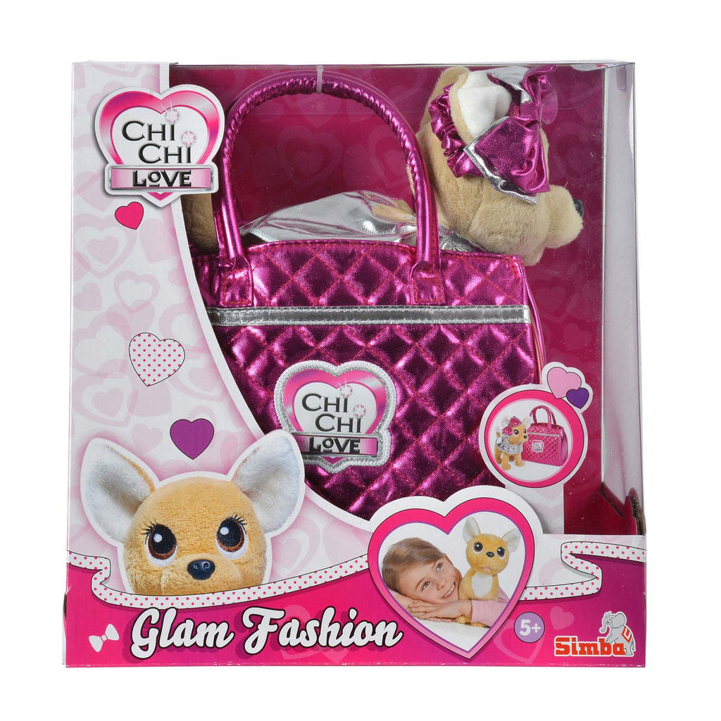 Puppy Chi Chi Love Glam Fashion houdt wel van wat glitter en glamour. Ze heeft een zilverkleurige mantel en een grote zilverkleurige/roze strik in het oor. Het liefst wilt ze gedragen worden in haar hippe blinkende gewatteerde handtas.