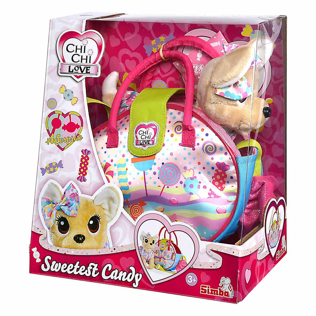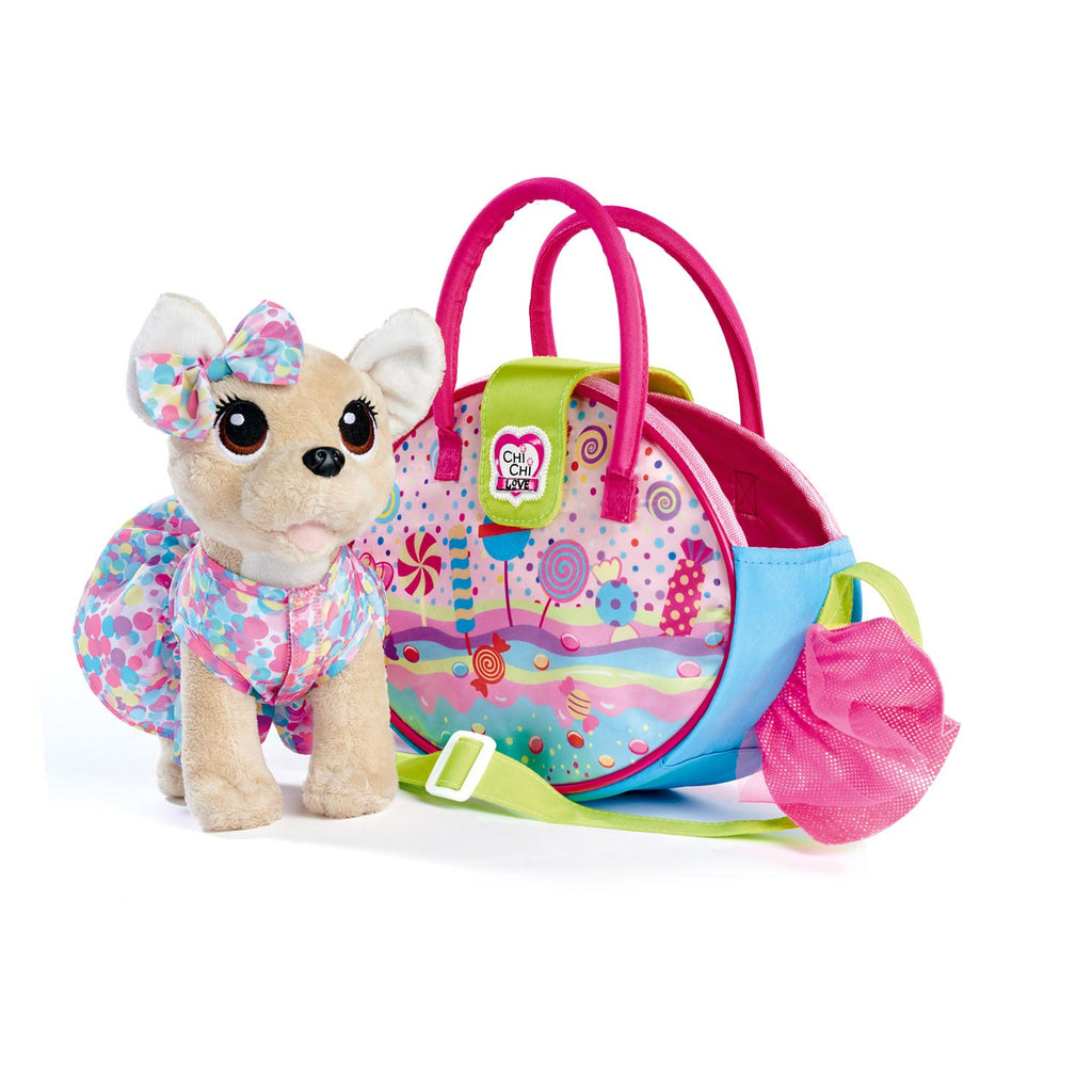 Wat een snoepie, dit leuke Chi Chi Love hondje! Neem hem mee naar huis, op stap of mee naar de speeltuin: dit hondje zit in een handige handtas waardoor hij overal mee naartoe kan. De tas heeft een schouderriem waarmee je hem ook handig om je schouder kunt hangen. Het Chi Chi Love Sweetest Candy-hondje is ongeveer 20 centimeter hoog en geschikt voor kinderen vanaf 3 jaar. Gemaakt van pluche