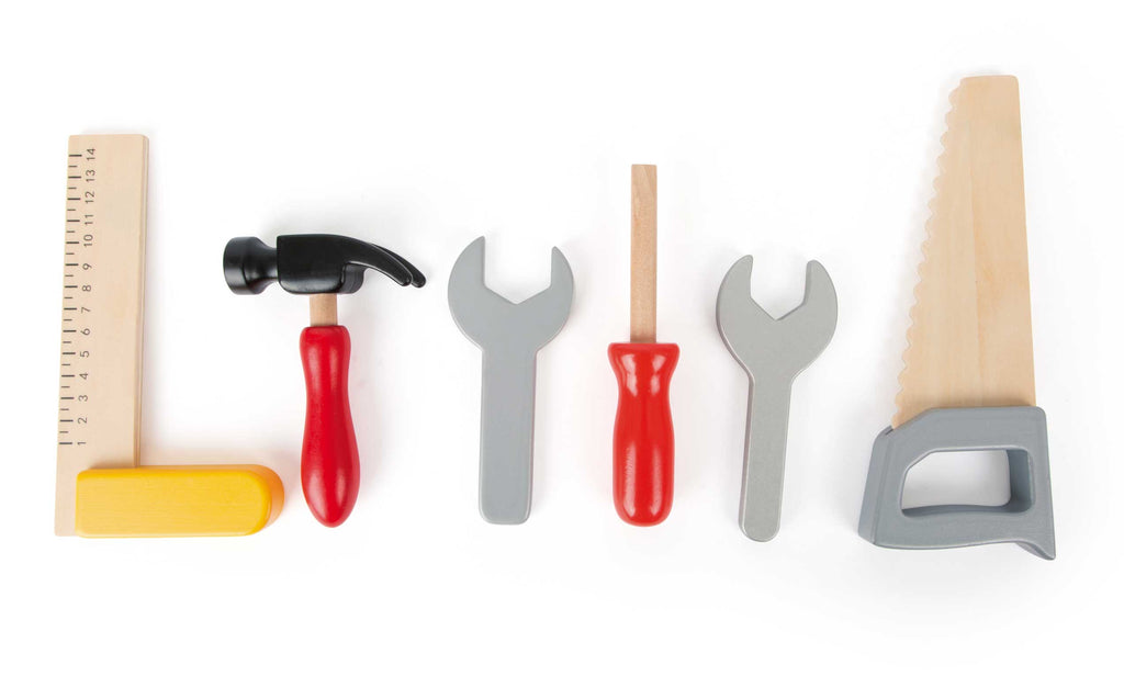Klussers en kunstenaars vinden hier alles wat ze nodig hebben! Als functionele werkbank met praktisch gereedschap of als ruimtebesparende schildertafel - voor creatieve geesten zijn beide varianten beschikbaar. Hier kunnen kinderen hameren, schroeven, zagen - en voor de afwisseling ook schilderen! Deze robuuste werkbank overtuigt door de talrijke accessoires, van de houten zaag tot de schroeven van stabiele kunststof. De achterwand kan worden neergeklapt en als schilder- en tekenvlak worden gebruikt! De papierrol bevindt zich onder de tafel en kan gemakkelijk worden bereikt en gebruikt. Een fantastisch stuk speelgoed voor de kinderkamer!