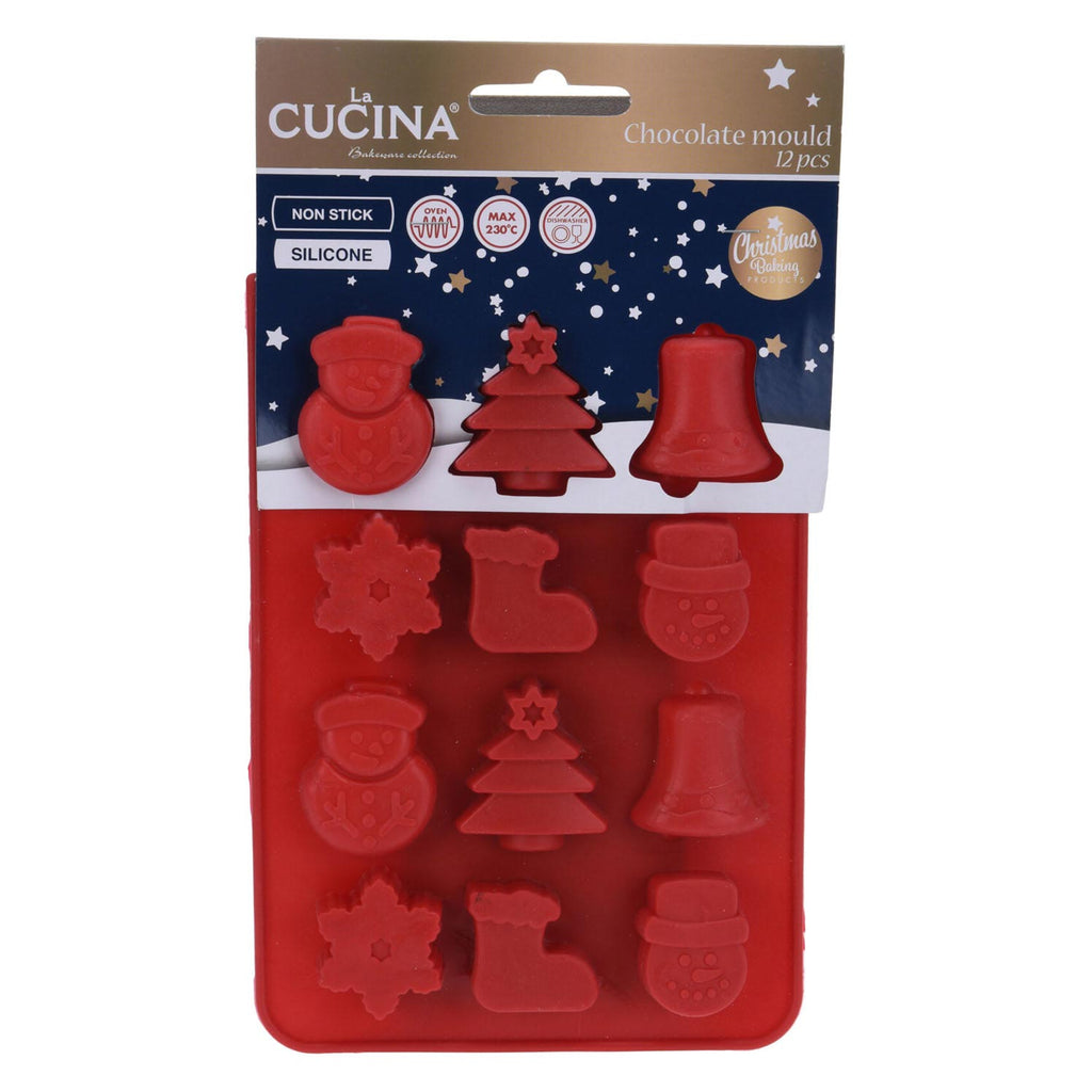 12 stuks chocolade bakvormen in kerstthema: een kerstbel, sok, kerstboom, sneeuwvlok en 2 verschillende sneeuwpoppen. Gemaakt van silicone. Geschikt voor de oven tot maximaal 230 graden Celcius. Geschikt voor de vaatwasser. Geschikt vanaf 3 jaar. De bakvormen zijn 7 bij 6 centimeter groot.
