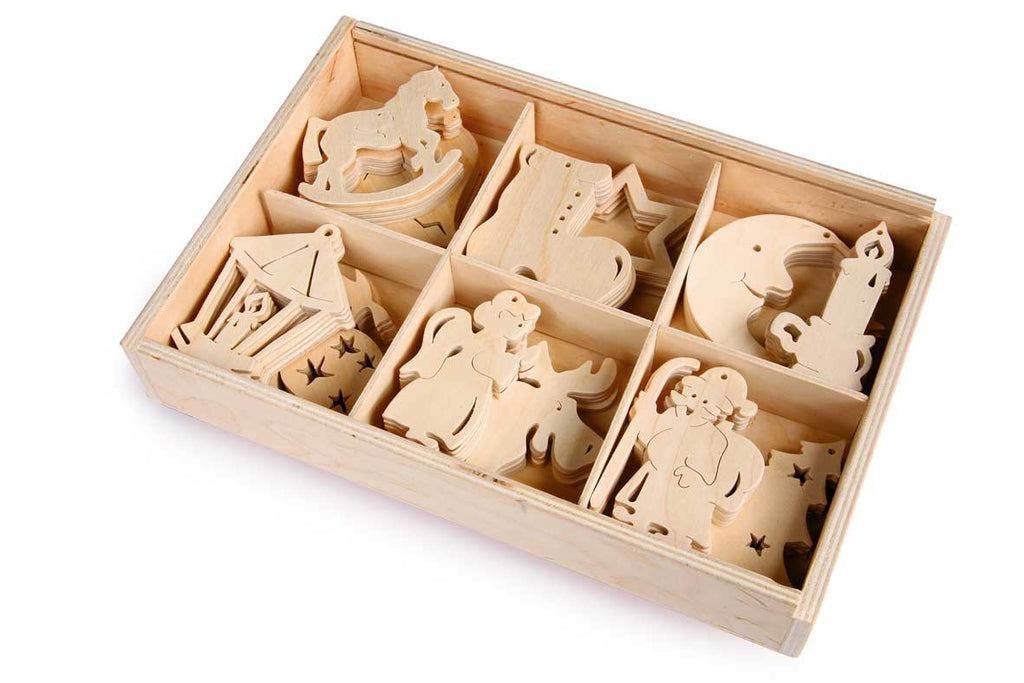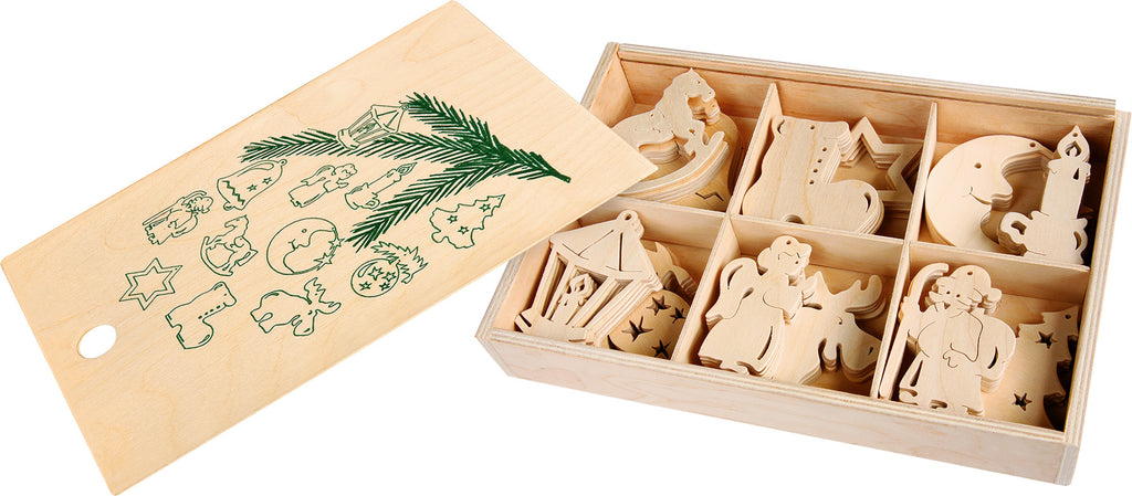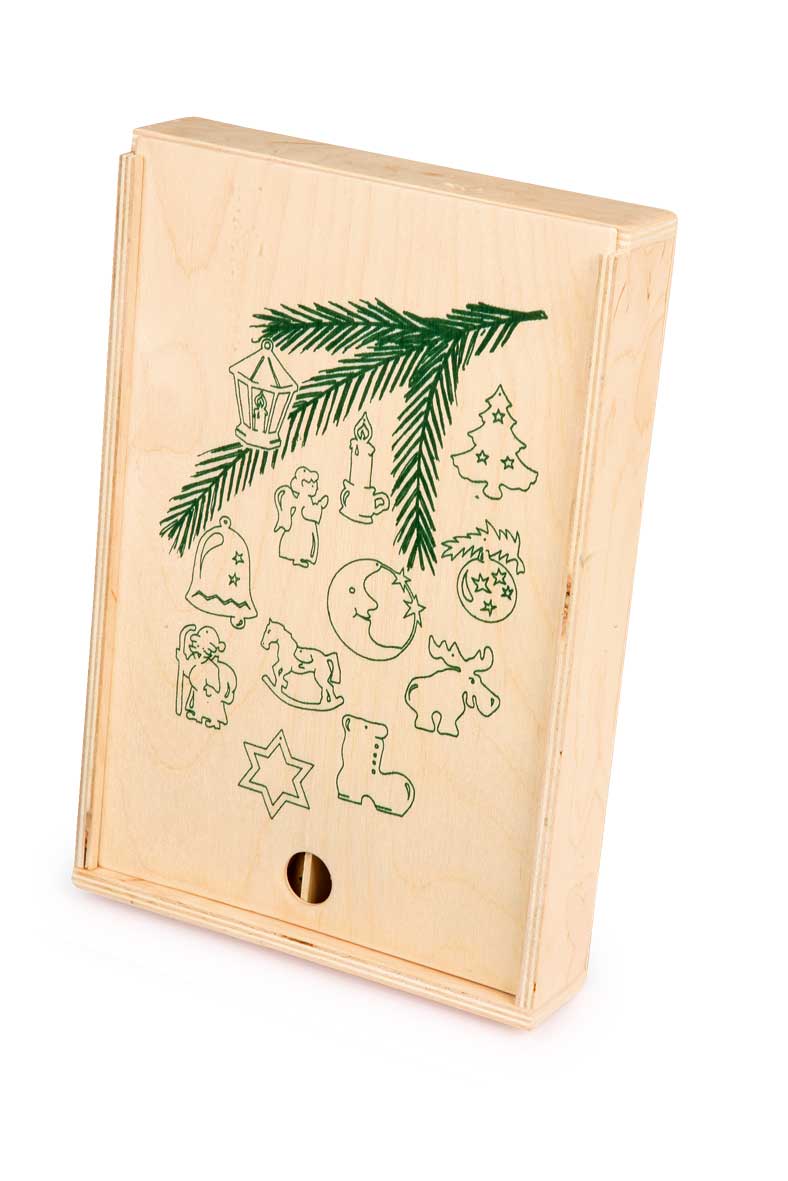 12 gedetailleerde uitgesneden afbeeldingen in een houten doos. Decoratie voor de kerstboom, de ramen of ook voor tafeldecoratie of een natuurlijk vormgegeven adventskrans!