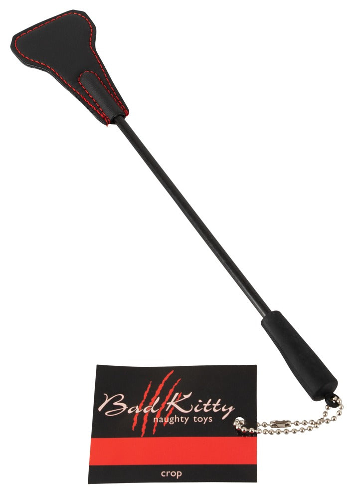 Kleine zwarte zweep met peddel (de optiek kan variëren). Een kant in lederlook, de andere met nepbont. Rode stiksels.