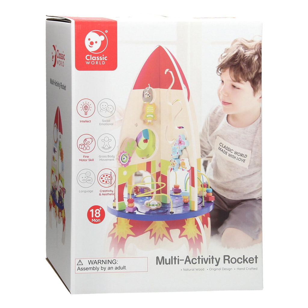 De Classic World Houten Activiteiten Raket met motoriekspiraal is gemaakt van hout. Met 5 verschillende spelletjes aan alle kanten van de kubus kun je elke dag iets anders doen. De verschillende activiteiten helpen bij het ontwikkelen van de zintuigen, de fijne motoriek en het herkennen van oorzaak-gevolg relaties. Vanaf 12 maanden.
