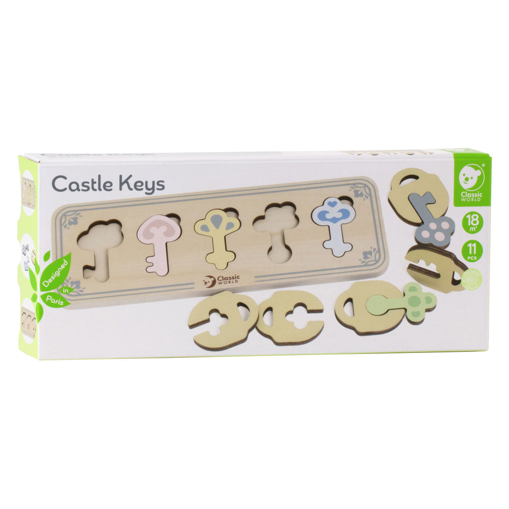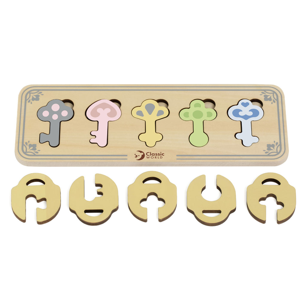 Houten puzzelspel waarbij kinderen de houten sleutels moeten matchen aan het juiste houten slot. Afmetingen: 28 x 15,8 x 9 centimeter. Geschikt vanaf 18 maanden.
