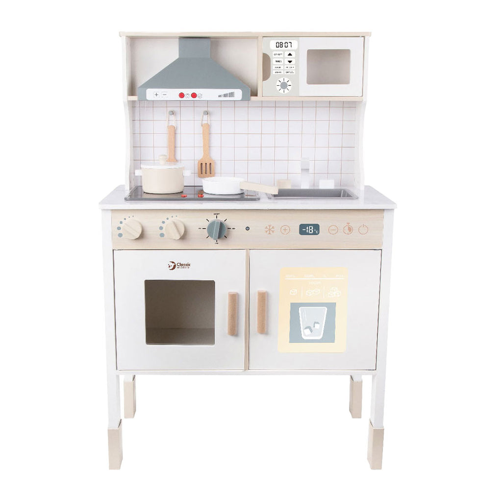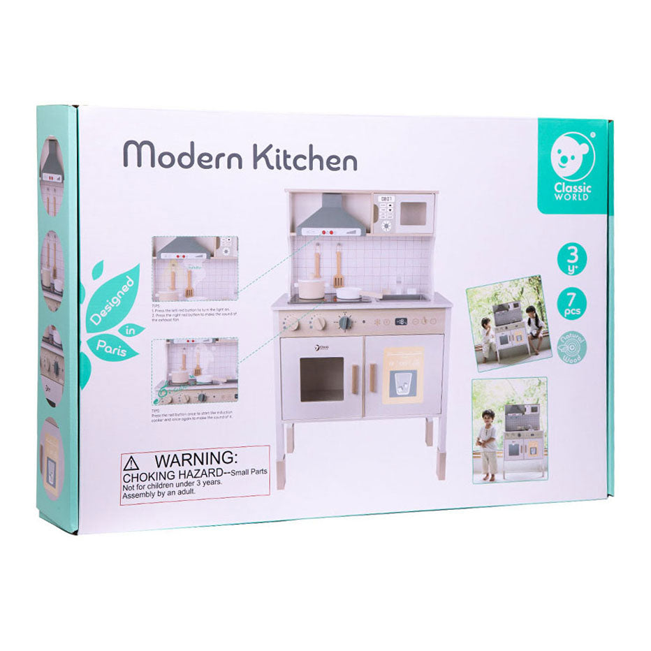 Deze moderne keuken heeft veel speelwaarden om de kookervaring leuk te maken. Het bevat een magnetron, oven, gootsteen en kookaccessoires. Het heeft ook een elektrische plaat met geluidseffecten van een afzuigkap en het geluid van kokende ingrediënten. Kinderen kunnen het plezier van een chef-kok ten volle ervaren.