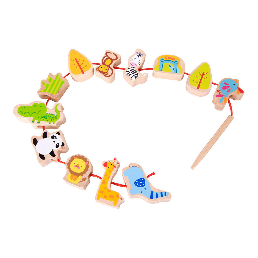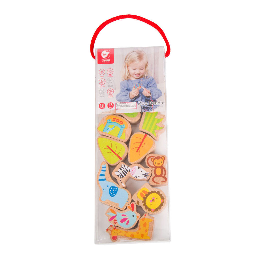 Houten rijgkralen met de opdruk van dierentuin dieren en planten. De set bevat 13 rijgkralen, een koord inclusief staafje om het rijgen makkelijker te maken en een opbergzakje. De kralen zijn geschikt voor kinderen vanaf 18 maanden en stimuleren de fijne motoriek, coördinatie en behendigheid.