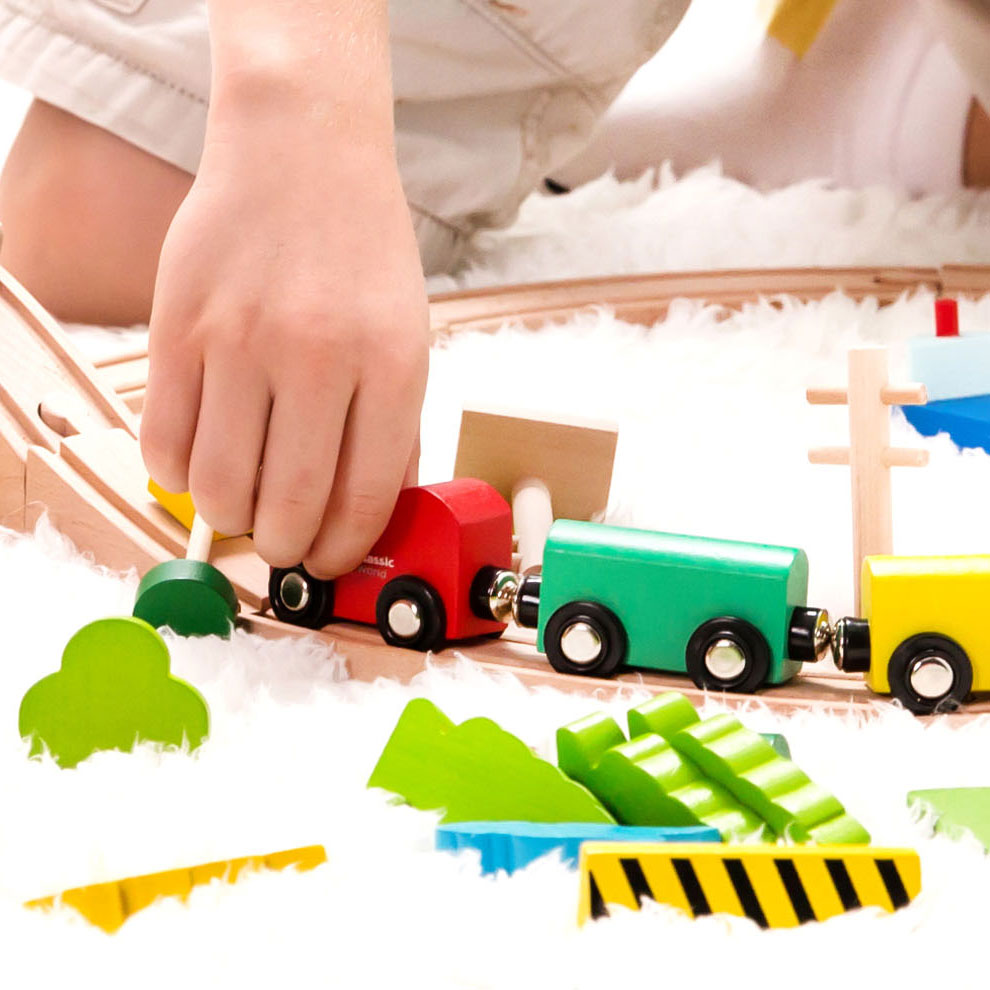 Met deze Classic World Houten Treinset, met maar liefst 75 onderdelen ben jij vast en zeker middagen zoet. De locomotief en wagons zijn magnetisch en rijden soepel over het houten spoor. Er is een hijskraan en een brug. Aan de hijskraan en de brug hangen katrollen waarmee je containers omhoog kunt hijsen en weer omlaag kan laten zakken. De treinset wordt geleverd met veel accessoires, zoals bomen, verkeersborden en speelfiguurtjes. Geschikt voor kinderen vanaf 3 jaar.
