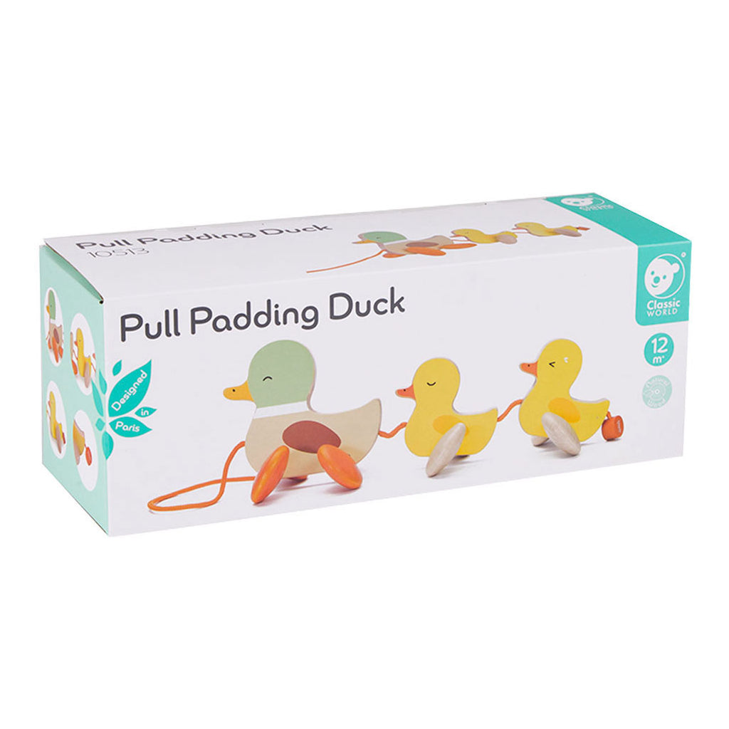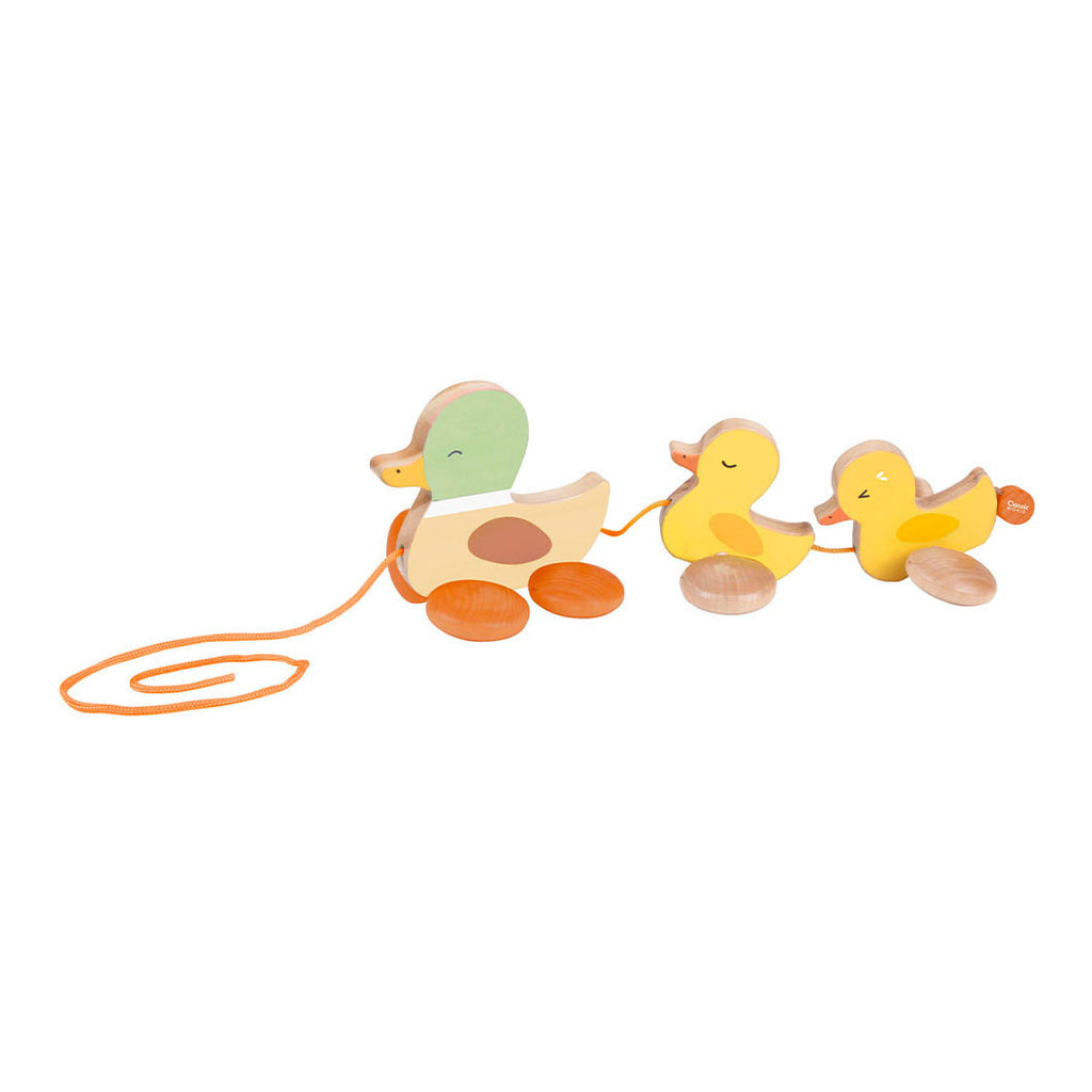 Een houten eend en twee houten kuikentjes aan een trekkoord. Kinderen vanaf 12 maanden kunnen met de eendjes spelen.