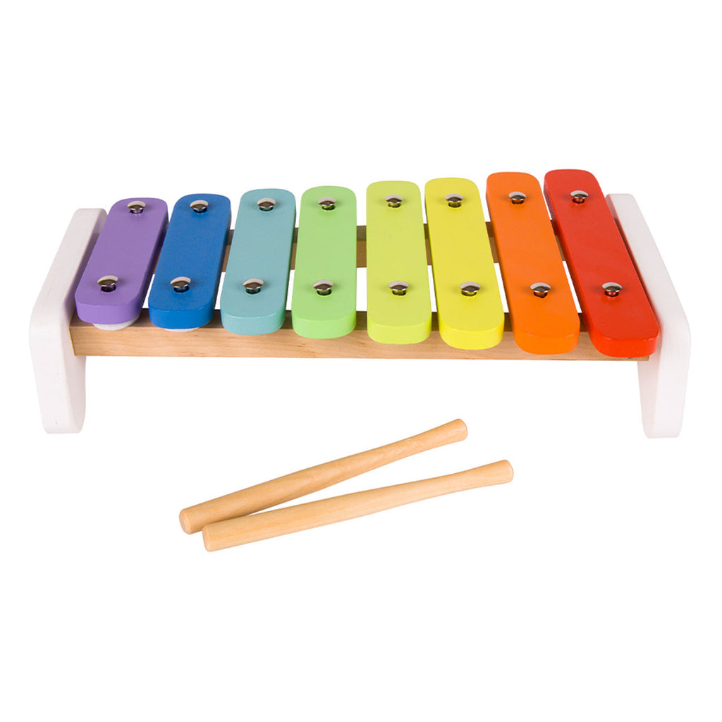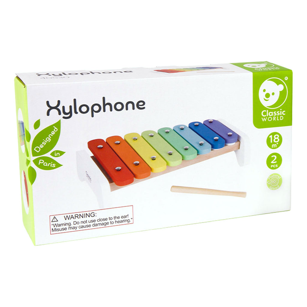 Houten regenboogxylofoon van Classic Toys. Dit 2-delige speelgoedinstrument is gemaakt van duurzaam hout en kindveilige verf. Houten speelstokje meegeleverd. Geschikt voor baby’s en kinderen vanaf 18 maanden.