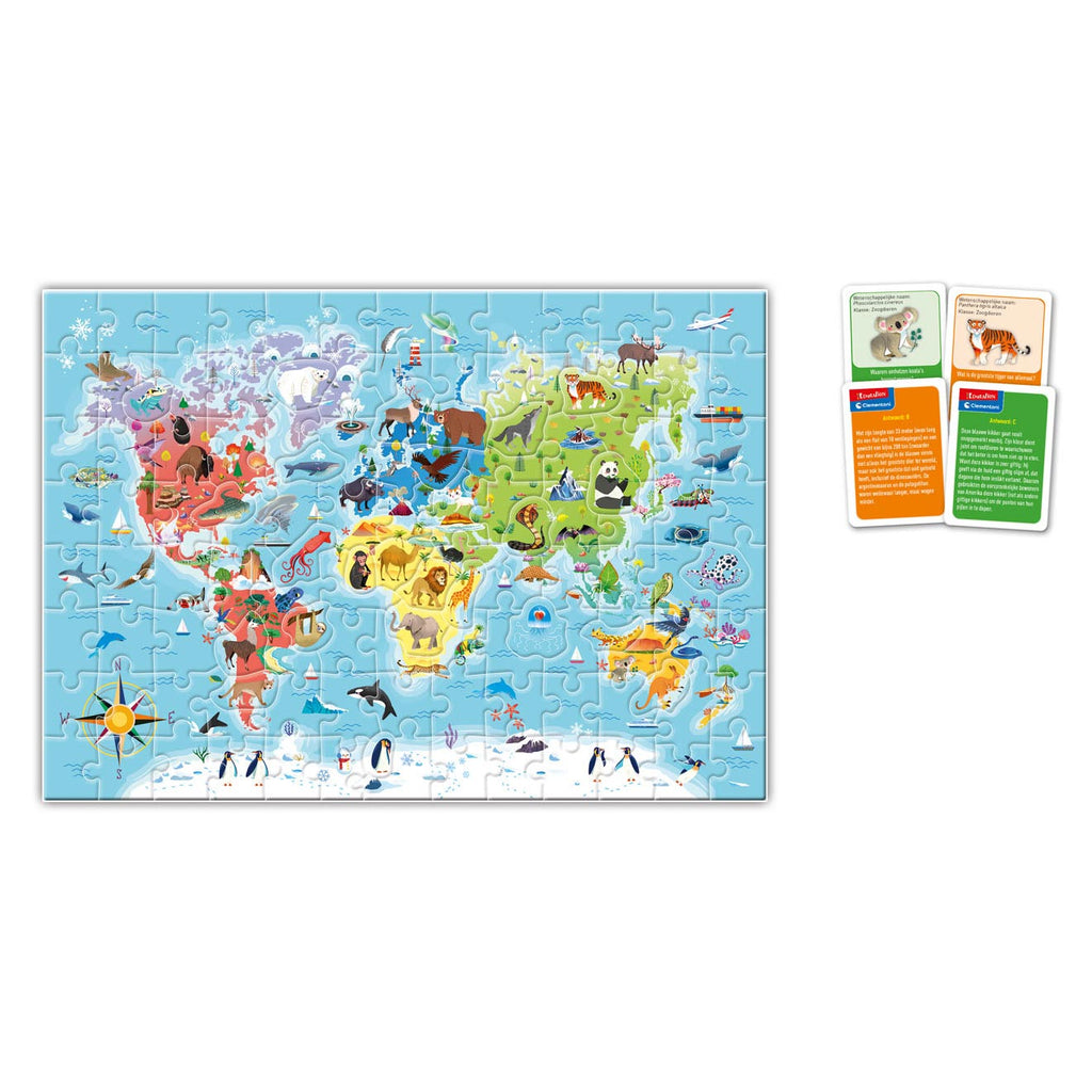 Een puzzel en vele spelactiviteiten om de dieren op aarde en hun leefomgevingen te ontdekken, en hun namen en classificatie te leren. Het spel bevat een grote puzzel van de wereld met de belangrijkste fysieke kenmerken, dierenvormen en afbeeldingen van typische vegetatie in verschillende habitats. Tevens inclusief informatiekaarten voor de classificatie van dieren. Het kind kan zich vermaken met het leggen van de grote puzzel en het passen van de dierenvormen in de juiste habitats. Verder bevat het gezelschapsspelletjes, uitdagingen, bingo en een zoekspel, om het zicht te verscherpen, het logisch denkvermogen te ontwikkelen en reflexen te trainen. Geschikt voor kinderen vanaf 6 jaar.