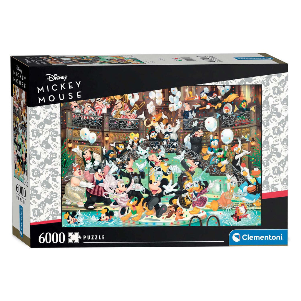 Grote legpuzzel van 6000 stukjes met een vrolijke afbeelding van Disney-karakters op een feestelijk gala. Gelegd is de puzzel 186 x 118 centimeter groot.