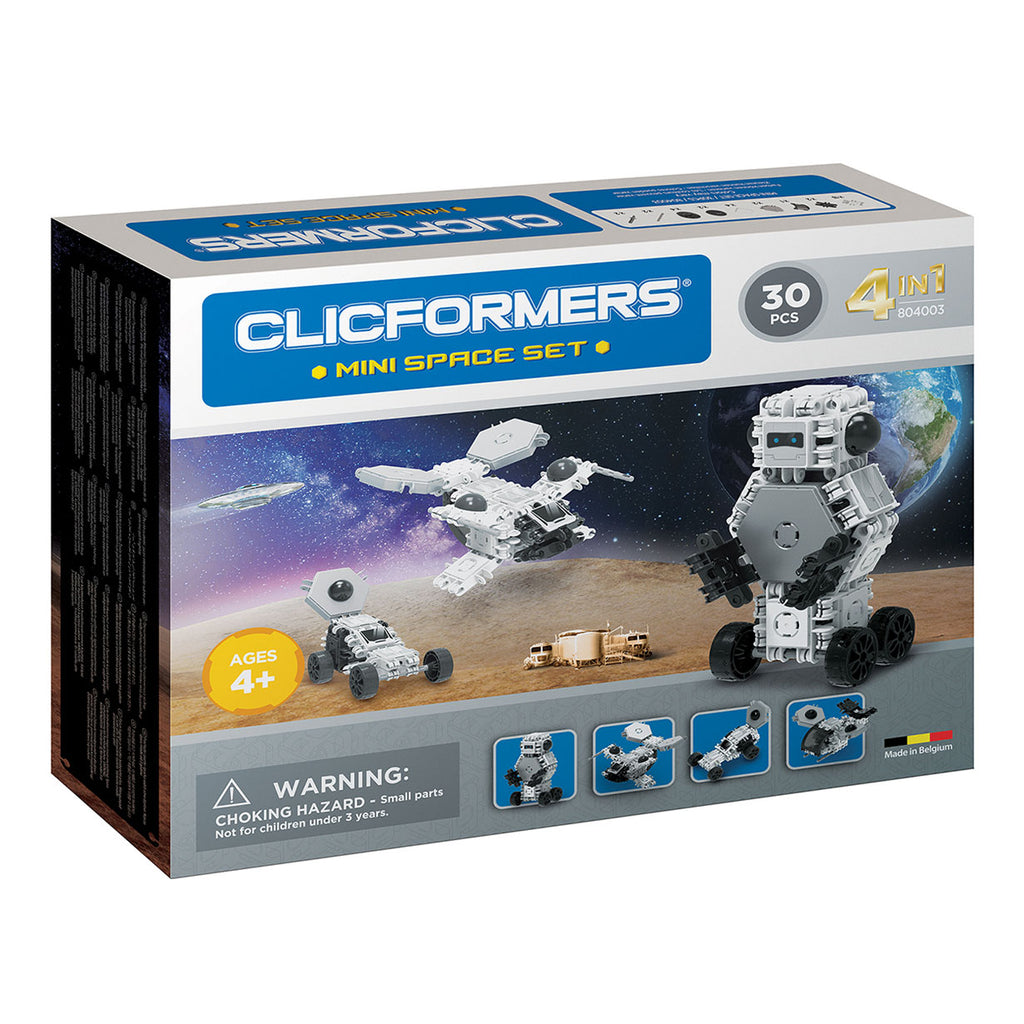 Met deze Mini Space set van Clicformers maak jij met de 30 stevige kunststoffen onderdelen 4 ruimtevaartvoertuigen. De onderdelen zijn makkelijk aan elkaar te klikken en zorgen voor eindeloos bouwplezier. Ben jij klaar om het heelal te verkennen?