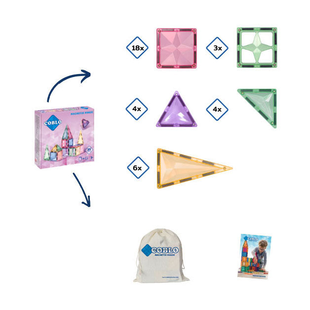 Deze bouwset bestaat uit 35 magnetische bouwblokken in pastel kleuren. Mooie, zachte tinten die voor een geheel andere uitstraling zorgen dan de classic stenen. Door de magneetjes in de stenen klik je de blokken makkelijk aan elkaar. Laat de fantasiewereld van kinderen in pastel kleuren!