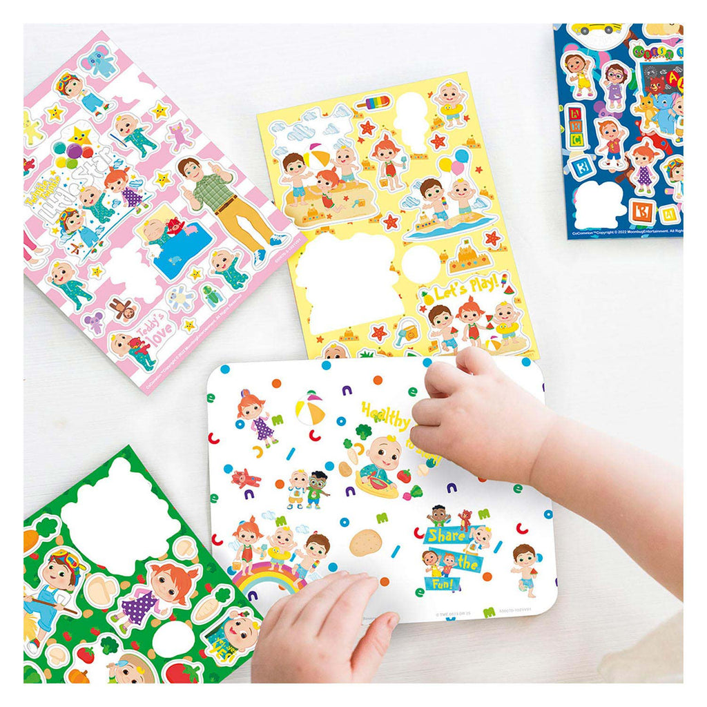 4 vellen Cocomelon-raamstickers en een kartonnen speelachtergrond. Herbruikbaar en geschikt voor kinderen vanaf 3 jaar oud.