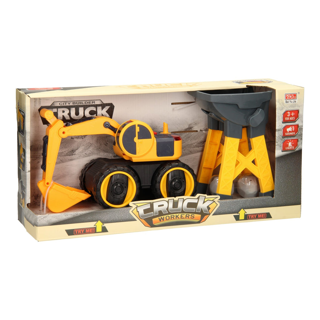 Laad de stenen in de graafmachine en gooi ze in de bak. Draai aan de hendel en de stenen vallen weer uit de bak. De graafmachine bevat licht en geluidseffecten voor een extra beleving. De set is gemaakt van stevig kunststof. Verzamel alle voertuigen van de set en bouw je eigen constructieteam! Inclusief batterijen.