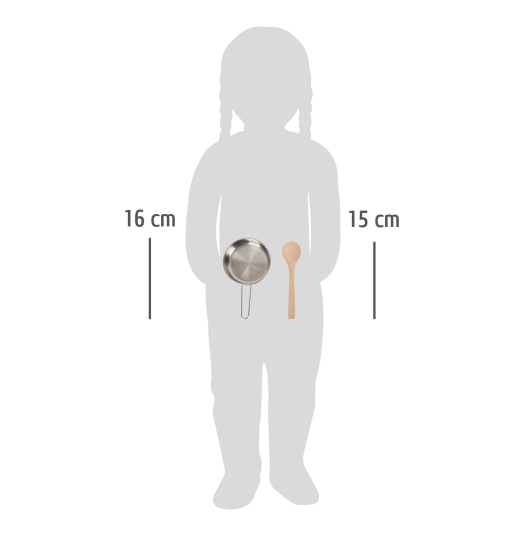 Speel Kookset met Schort, 9dlg, met een kookschort, pannenlappen, metalen pannen, een spatel, een houten pollepel en een garde.