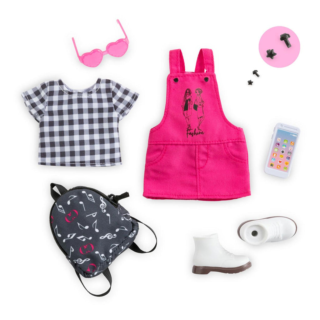 Een leuke modebewuste outfit voor jouw Corolle Girls pop. Set bestaat uit een zwartwit geruit shirt, een roze overalljurk, zwarte oorbellen, roze zonnebril, een witte smartphone, zwarte rugzak en witte laarzen. Pop niet inbegrepen. Geschikt voor kinderen vanaf 4 jaar oud.