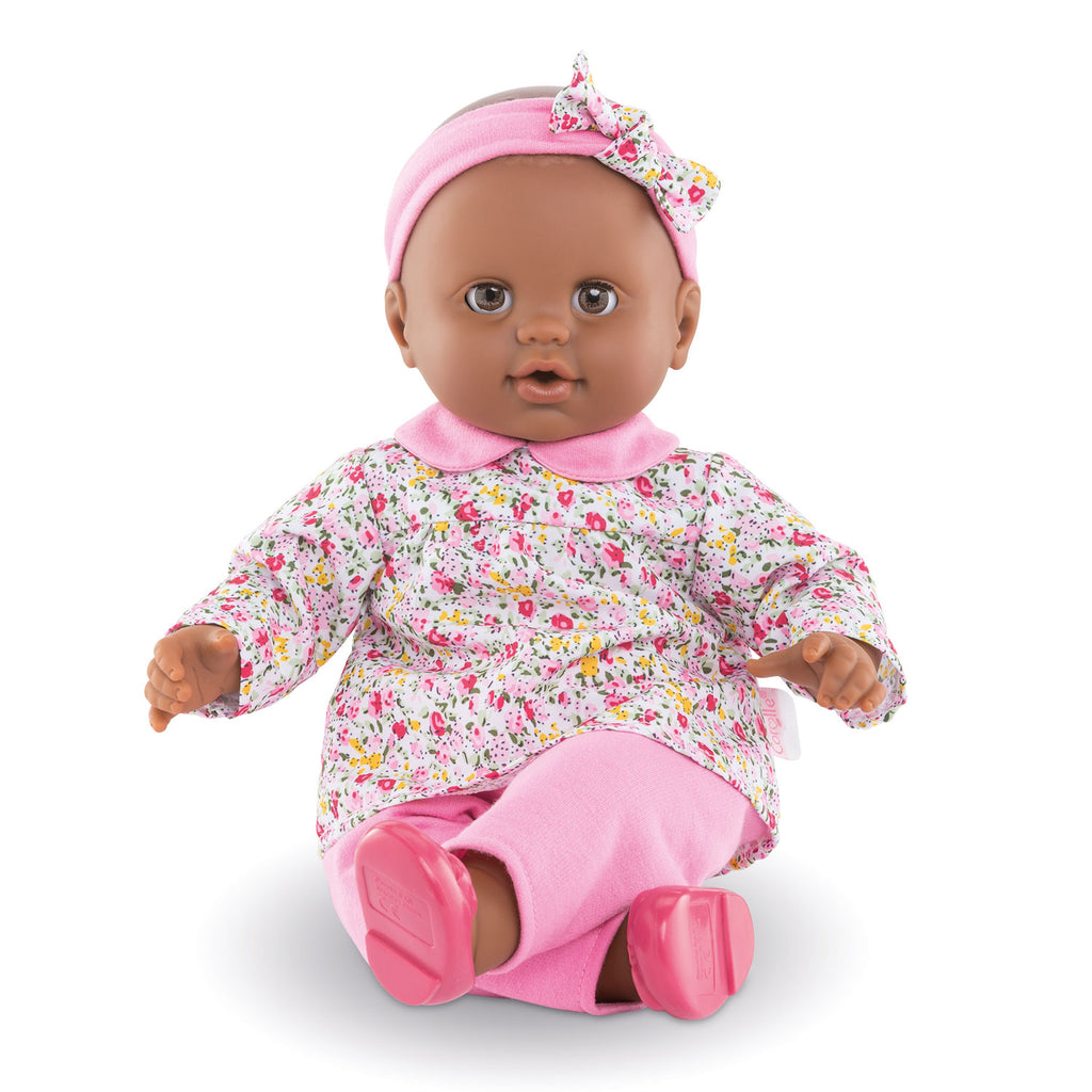 Deze grote baby pop van Corolle heeft een ideaal formaat voor iets grotere kinderen. Babypop Lilou heeft een fluweelzacht roze broekje aan en een blousje bedrukt met vrolijke bloemen. Ze draagt roze ballerina's en ze heeft een roze haarband op haar hoofd met een strikje. De kleding van het popje kan aan- en uitgetrokken worden. Lilou heeft bruine ogen en wanneer je haar neerlegt sluiten haar oogjes door de sleeping eyes. Het popje kan ook duimen als je de duim in haar mondje stopt. De pop is gevuld met een zachte vulling. Het gezichtje, de armpjes en de beentjes zijn van buigzaam vinyl en hebben een subtiele vanillegeur.