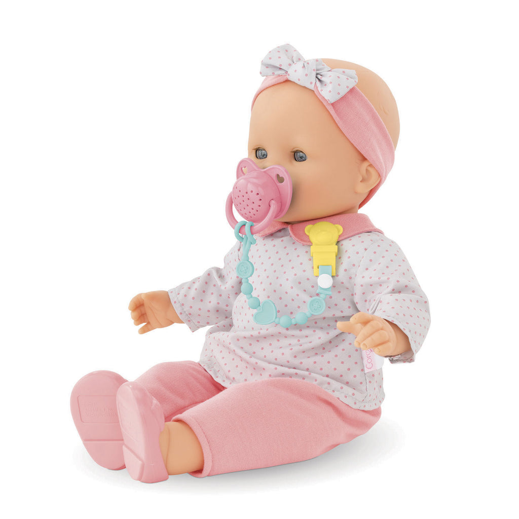 De Corolle Mon Grand Poupon - Interactieve Speen is geschikt voor Corollle poppen met een lengte van 36 cm. Klem de speen vast aan de poppenkleding en stop de speen in de mond van de pop. Druk op de roze speen en je hoort maar liefst 15 verschillende babygeluiden. Werkt op 3 knoopcelbatterijen (batterijen zijn inbegrepen).