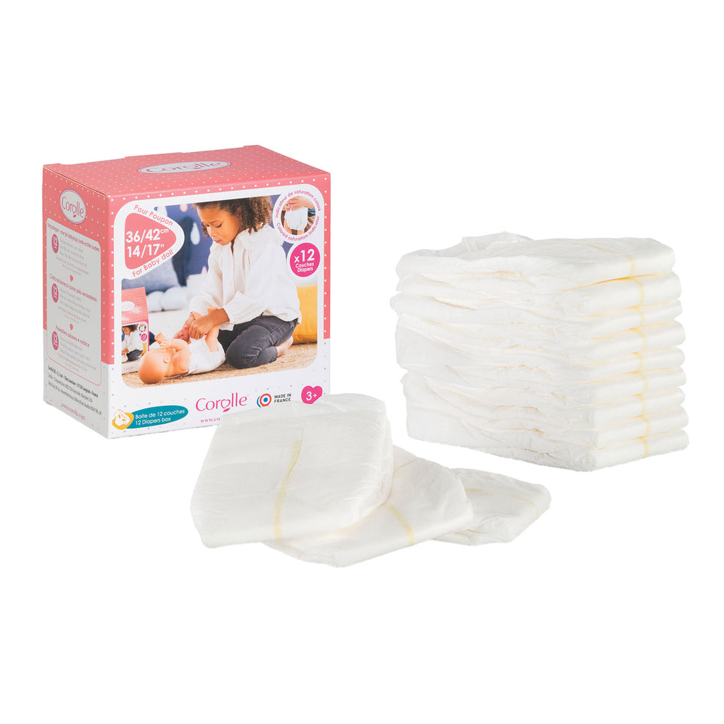 Doos met 12 luiers voor poppen van 36 tot 42 cm groot. Geschikt voor kinderen vanaf 3 jaar oud.