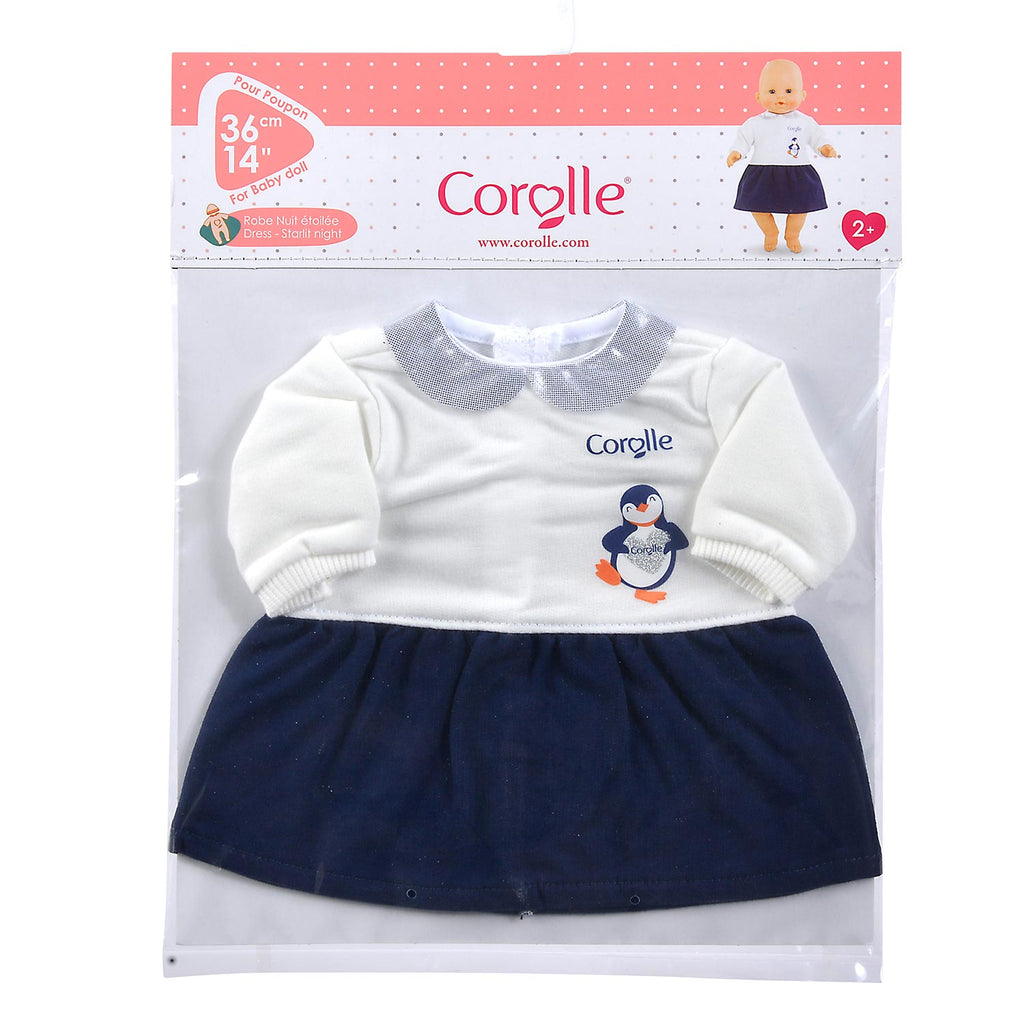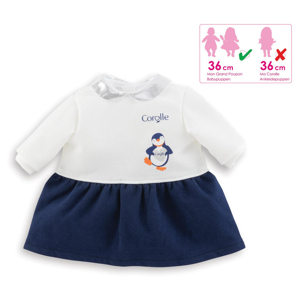 Winters poppenjurkje van Corolle voor poppen van 36 centimeter groot. Nachtblauwe rok en een schattige pinguïnprint met lange mouwen. Geschikt voor kinderen vanaf 18 maanden.