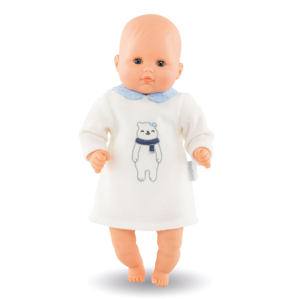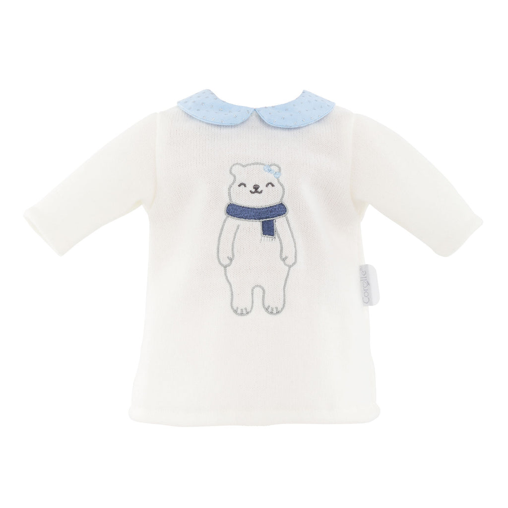 Dit fluweelzachte witte jurkje is helemaal in wintersferen. Het jurkje is bedrukt met een schattige ijsbeer die een sjaaltje draagt en een strik op zijn hoofd heeft. Het jurkje heeft een lichtblauwe kraag met glitters.