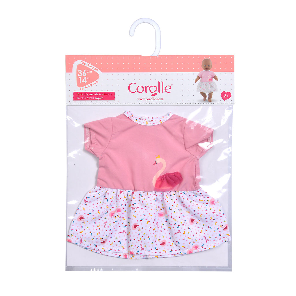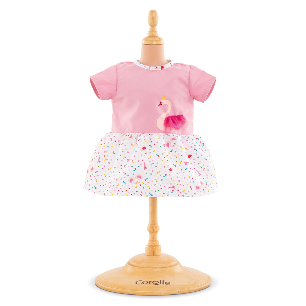 Dit jurkje met korte mouwen is helemaal in zwanenthema. Op het bovenstuk van het jurkje staat een zwaan afbeeld met tutu vleugels en het zwierige witte rokje is vrolijk bedrukt met zwanen en gekleurde stippen. Geschikt voor Corolle poppen van 36 centimeter.