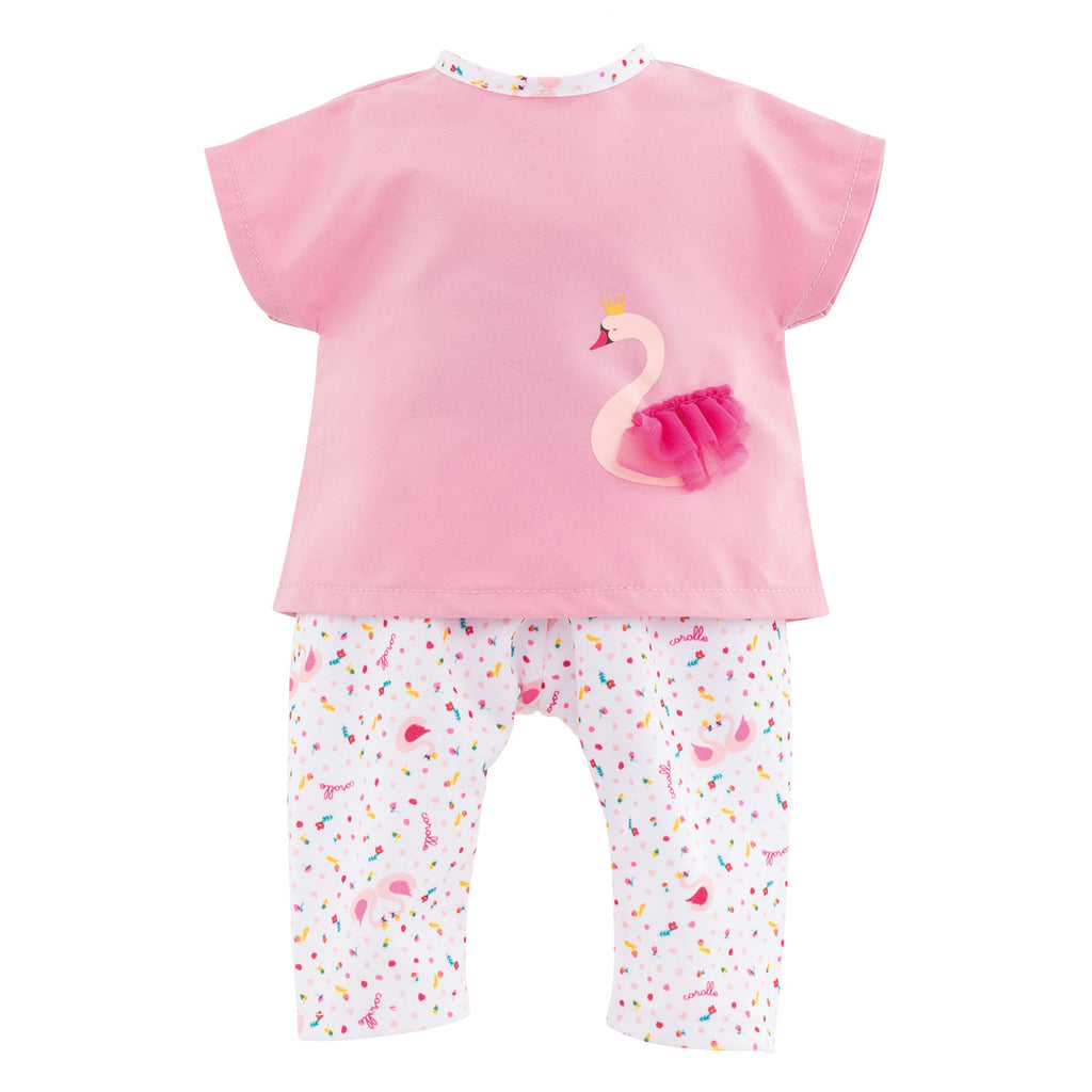 Dit pakje met korte mouwen is helemaal in zwanenthema. Op het shirtje staat een zwaan afbeeld met tutu vleugels en het witte broekje is vrolijk bedrukt met zwanen en gekleurde stippen. Geschikt voor Corolle poppen van 36 centimeter.