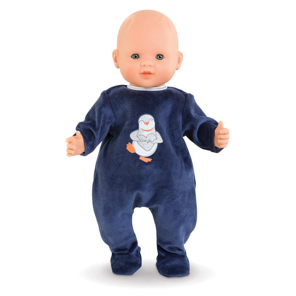 Fluweelzachte poppenpyjama van Corolle in nachtblauw en met een print van een pinguïn. Met klittenbandsluiting en gemaakt voor poppen van 30 centimeter groot. Gechikt voor kinderen vanaf 2 jaar.