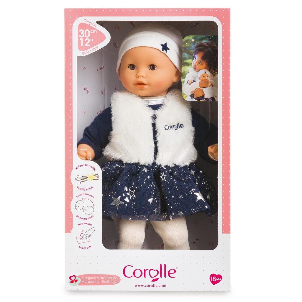 Schattige babypop met winters sterrenjurkje van 30 centimeter groot. Met sluitende ogen en kenmerkende vanillegeur. Gemaakt van vinyl en geschikt voor kinderen vanaf 18 maanden.