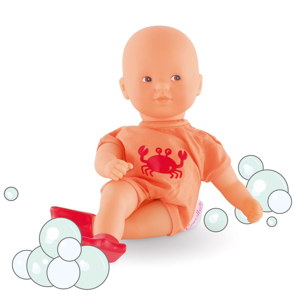 Dit leuke badpopje van het Franse merk Corolle is gekleed in een oranje zwempakje met rode flippers. De zwemkleding en flippers van het popje kunnen niet aan-of uitgetrokken worden. De babypop is 20 cm en is in het midden gevuld met een zachte vulling. Het gezichtje, de armpjes en de beentjes zijn gemaakt van buigzaam vinyl en hebben een subtiele vanillegeur.