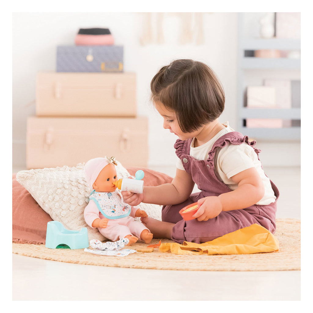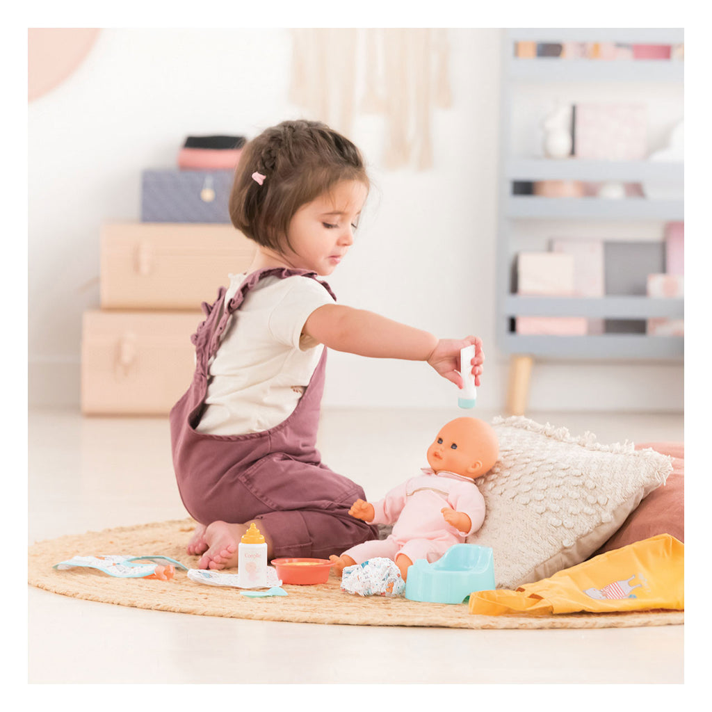 Poppen verzorgingsset met een gevulde verzorgingstas met een melkflesje, hapje met een lepel, slab, babykoekje, potje, babyzalf, speen, broek en doekje. Geschikt voor de Mon Premier Poupon van Corolle of een pop van ongeveer 30 cm.