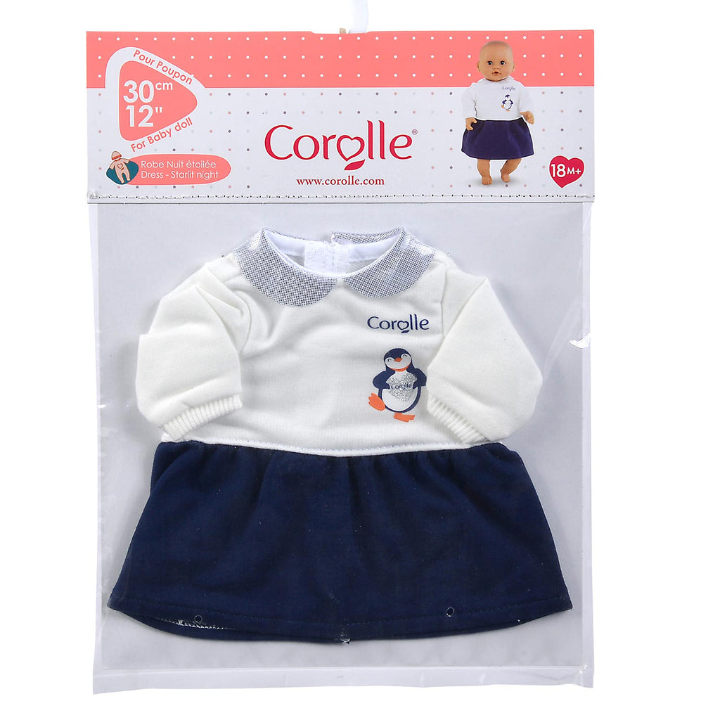 Winters poppenjurkje van Corolle met lange mouwen en een pinguïnprint. Geschikt voor poppen van 30 centimeter groot en kinderen vanaf 18 maanden.