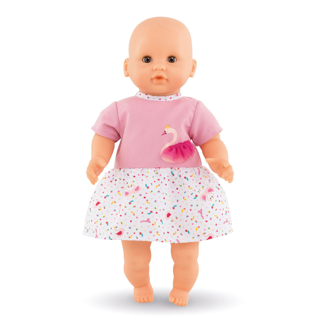 Dit jurkje met korte mouwen is helemaal in zwanenthema. Op het bovenstuk van het jurkje staat een zwaan afbeeld met tutu vleugels en het zwierige witte rokje is vrolijk bedrukt met zwanen en gekleurde stippen. Geschikt voor Corolle poppen van 30 centimeter.