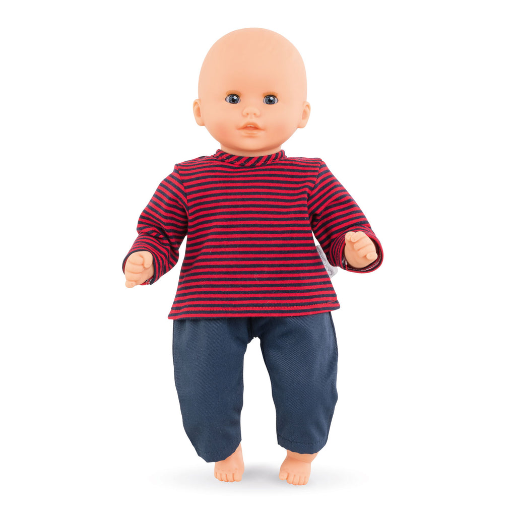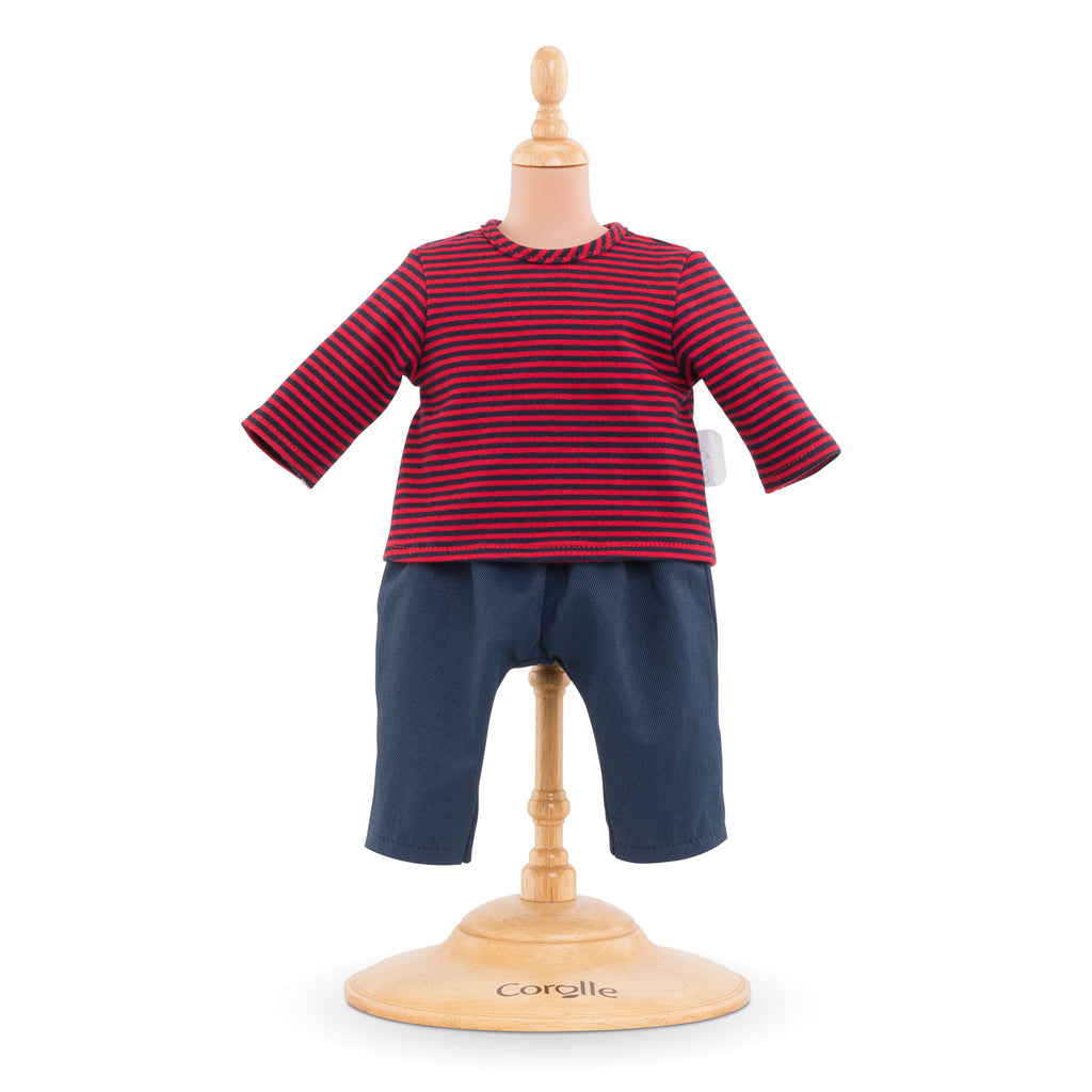 Kleed jouw pop aan in dit leuke marinekleurige pakje! Deze mooie poppenoutfit bestaat uit een rood-blauw gestreept shirt met een donkerblauwe bijpassende broek. Naar welke gelegenheid gaat jouw pop in deze mooie outfit? Geschikt voor poppen tot 30 centimeter.