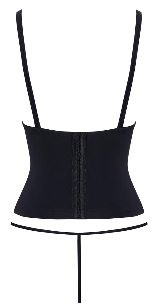 Zwarte taille corsage van Cottelli PARTY met verstelbare gespbandjes aan de zijkanten. Met cupbeugels om de borsten licht te ondersteunen. Met twee geïntegreerde voorgevormde baleinen aan de voorkant en 2 decoratieve, verstelbare gespbandjes. Met haakjessluiting op de rug. Een sensuele blikvanger wanneer solo gedragen. Gedragen met een shirt of blouse eronder, een stijlvol korset voor curveverhogende stijlen. Overal zacht en elastisch voor maximaal comfort. De bijpassende ministring is inbegrepen!