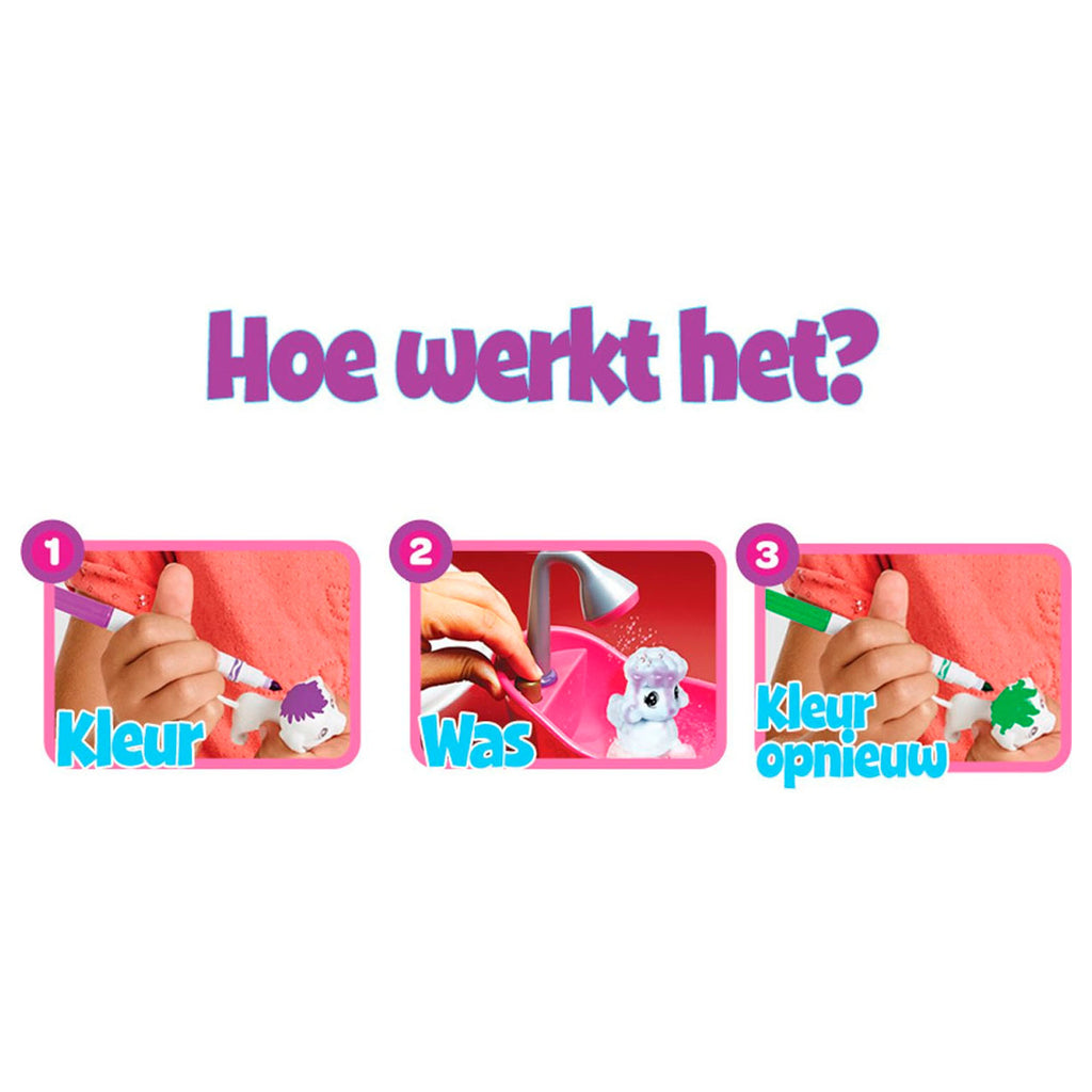 Er hangt magie in de lucht met de Washimals! In deze kleurset vind je vier Washimals fantasiedieren om in te kleuren en verzorgen. Geef de eigenaardige diertjes kleurrijke designs met de maar liefst 6 bijgeleverde afwasbare viltstiften. Ben je gek opeenhoorns of draakjes dan kun je nu je favorieten dieren een leuk patroontje geven! Klaar met kleuren en versieren? Geef je nieuwe favoriete wezens dan een bad om ze schoon te maken! Gebruik het schoonmaakborsteltje en was de inkt van de diertjes. Ze worden weer helemaal wit om ze opnieuw te kunnen versieren. Zo heb je dus eindeloos creatief kleurplezier!