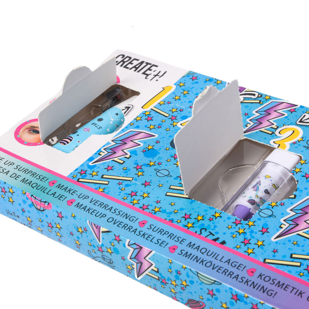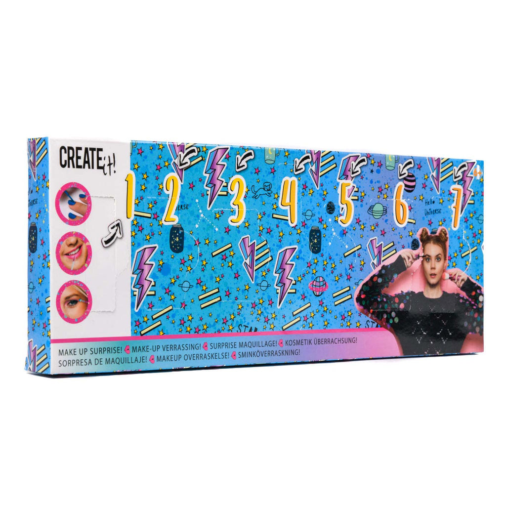 Create It! 7 Days Surprise Set. Achter elk deurtje zit een make-up verassing verstopt zoals een potje nagellak, een lippenstift of glitter oogschaduw.