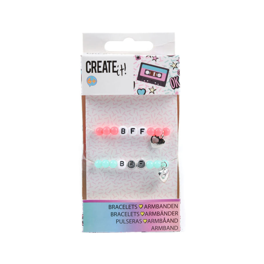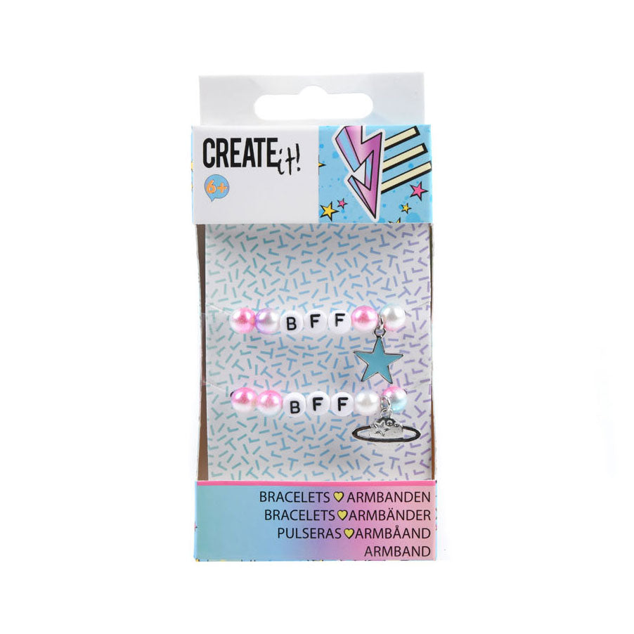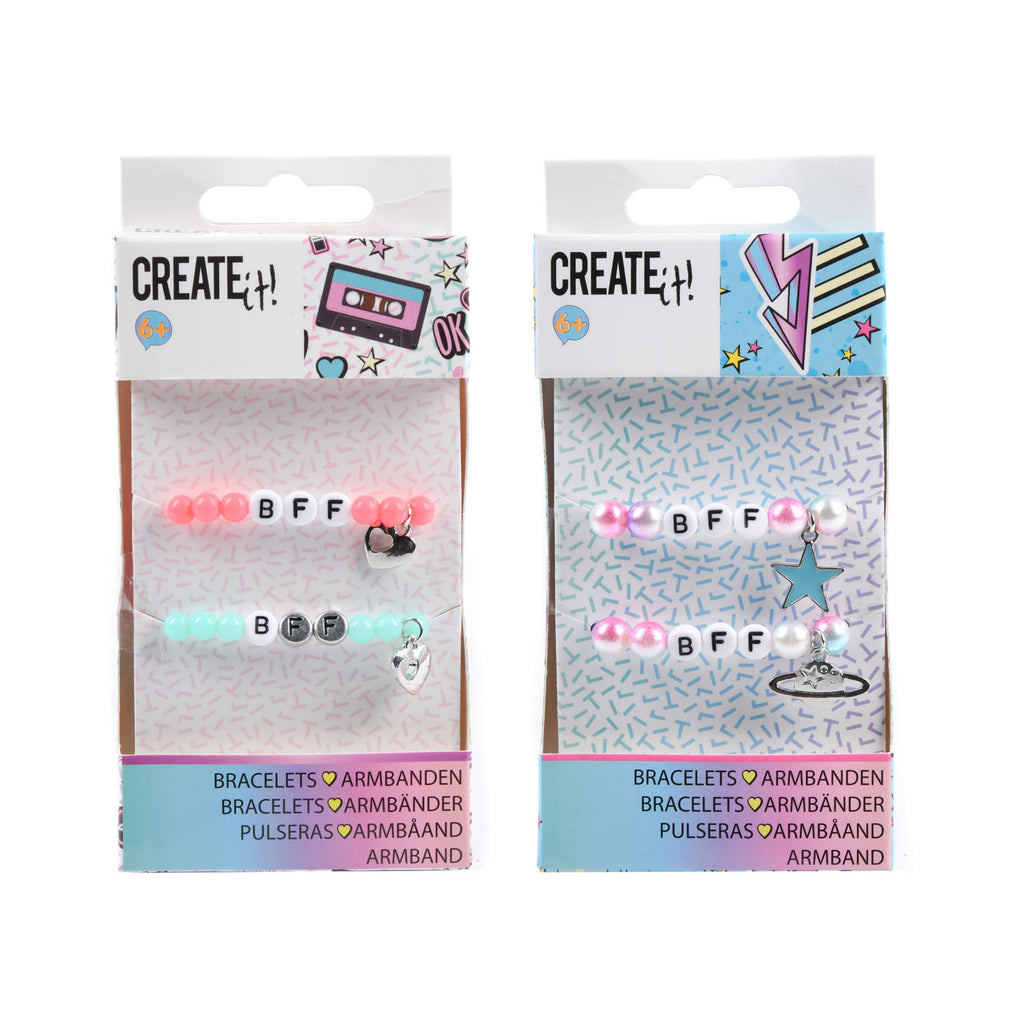 Create It! BFF Armbandjes. De kralenarmbanden zijn verkrijgbaar in twee soorten: lichtroze en lichtblauwe kralen en een hartjes bedeltje of een combinatie van paarse, lichtblauwe en lichtgroene kralen en een ster of planeten bedeltje. Beide BFF Armbandjes dragen de tekst 'BFF'.